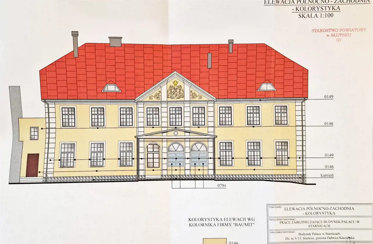Zespół znajduje się w wykazie zabytków Wojewódzkiego Urzędu Ochrony Zabytków w Gdańsku pod nr ewidencyjnym A-104. W 2016 roku wykonano projekt budowlany remontu pałacu - Starnice, a Pomorski Wojewódzki Konserwator Zabytków wydał decyzję (16.09.2016) pozwalającą na wykonanie robót budowlanych w pałacu w Starnicach wpisanym do rejestru zabytków decyzją nr KLIV-Oa/25/66 z dnia 15 lutego 1966 r. Wspólnota ma już wykonany projekt.