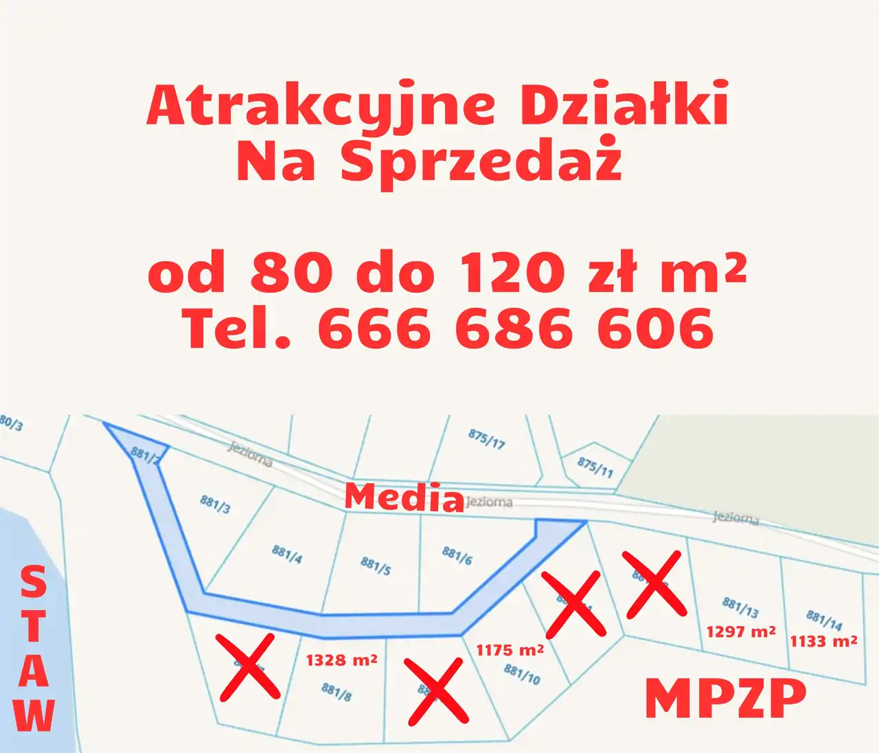 Od 80 zł/m² do 120 zł/m², zależnie od lokalizacji działki względem miejskiego stawu.