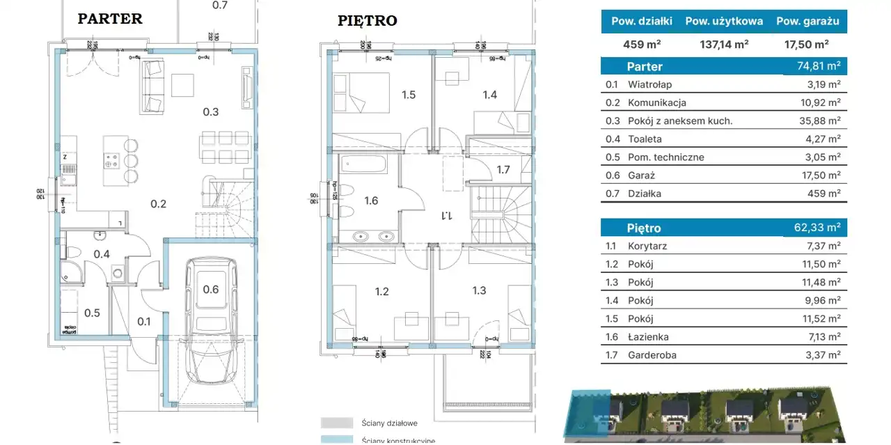 strefa sypialniana- piętro: cztery pokoje o pow. 11,50m.kw, 11,44m.kw, 11,52m.kw i 9,96m.kw, łazienka o pow. 7,13m.kw, garderoba o pow. 3,37m.kw. Dodatkowa powierzchnia to korytarze oraz garaż o pow. 17,50m.kw.