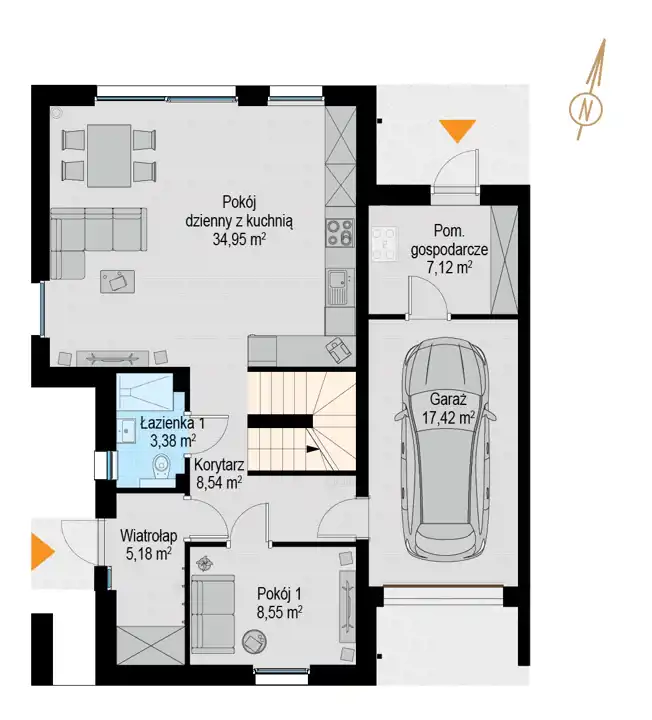 pokój dzienny z aneksem kuchennym – 34, 95 m²