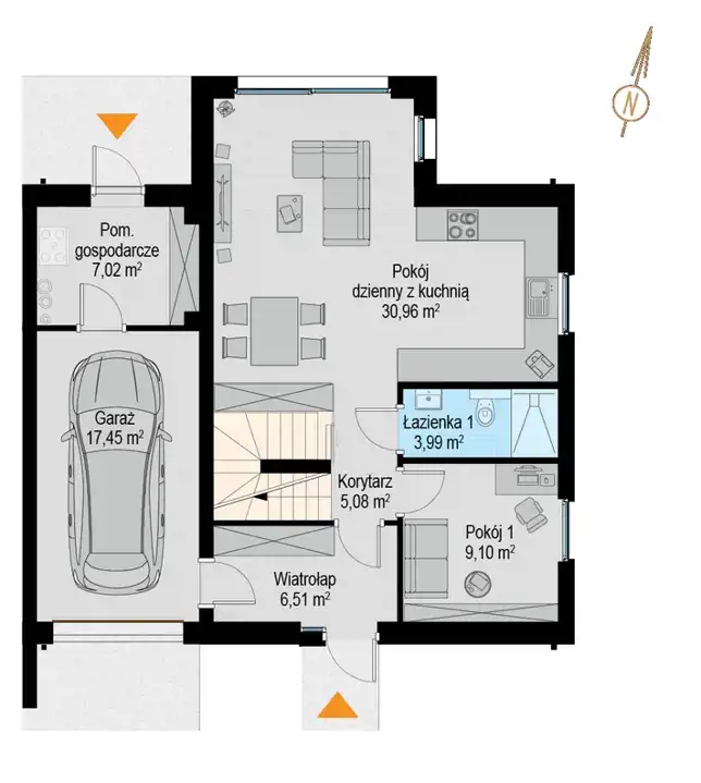 • Salon z kuchnią – 30,96 m² (wyjście do ogrodu!)