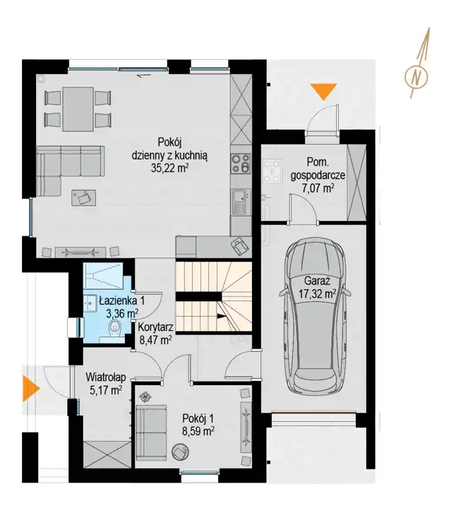 pokój dzienny z aneksem kuchennym – 35,22 m²