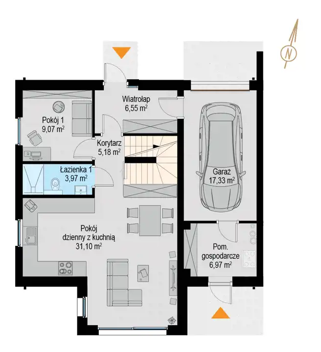 pokój dzienny z aneksem kuchennym – 31,10 m²