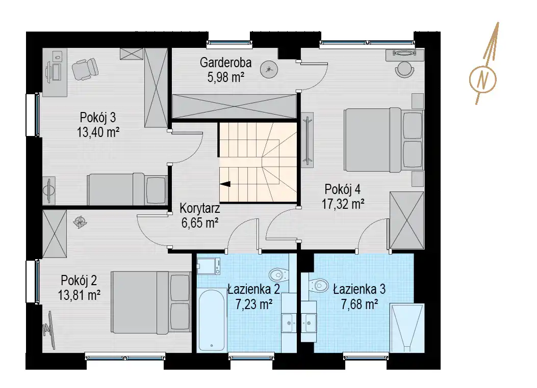 sypialnia – 17,32 m² + łazienka – 7,68 m² + garderoba – 5,98 m²