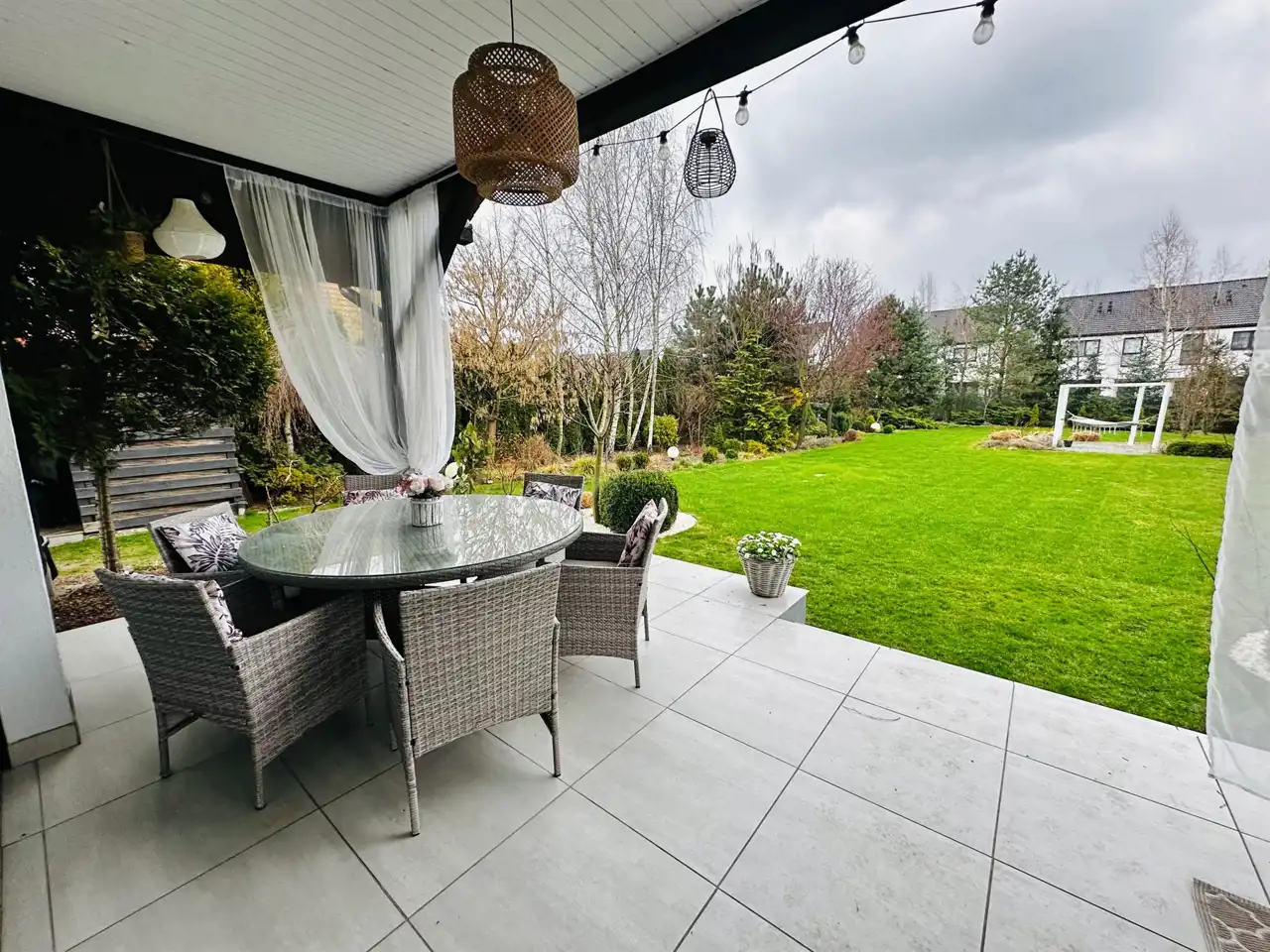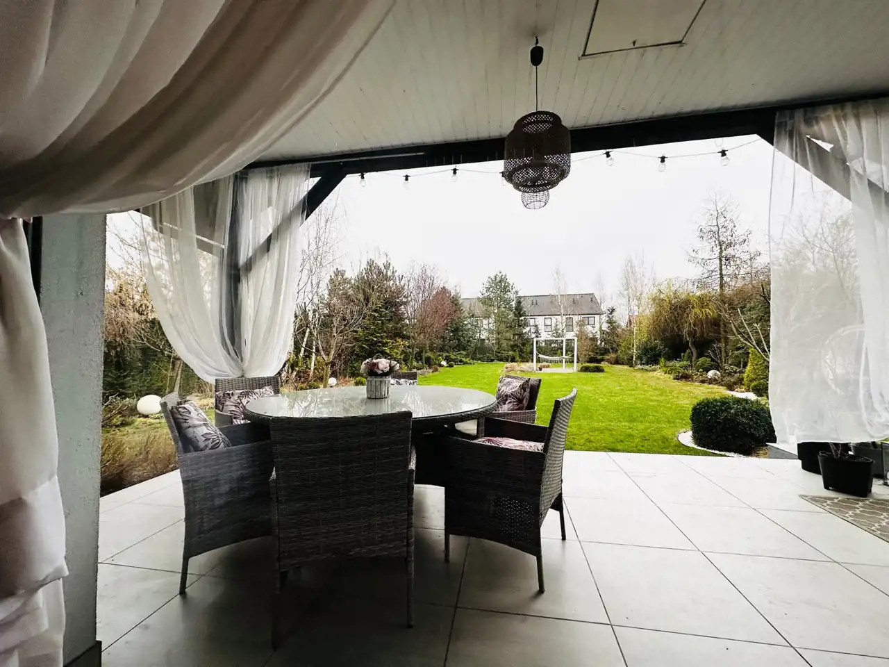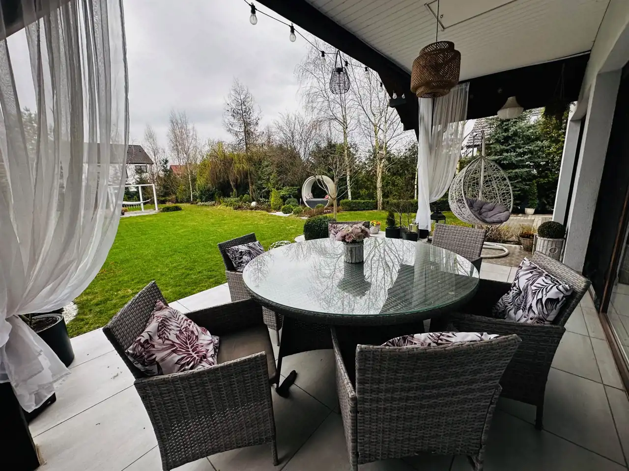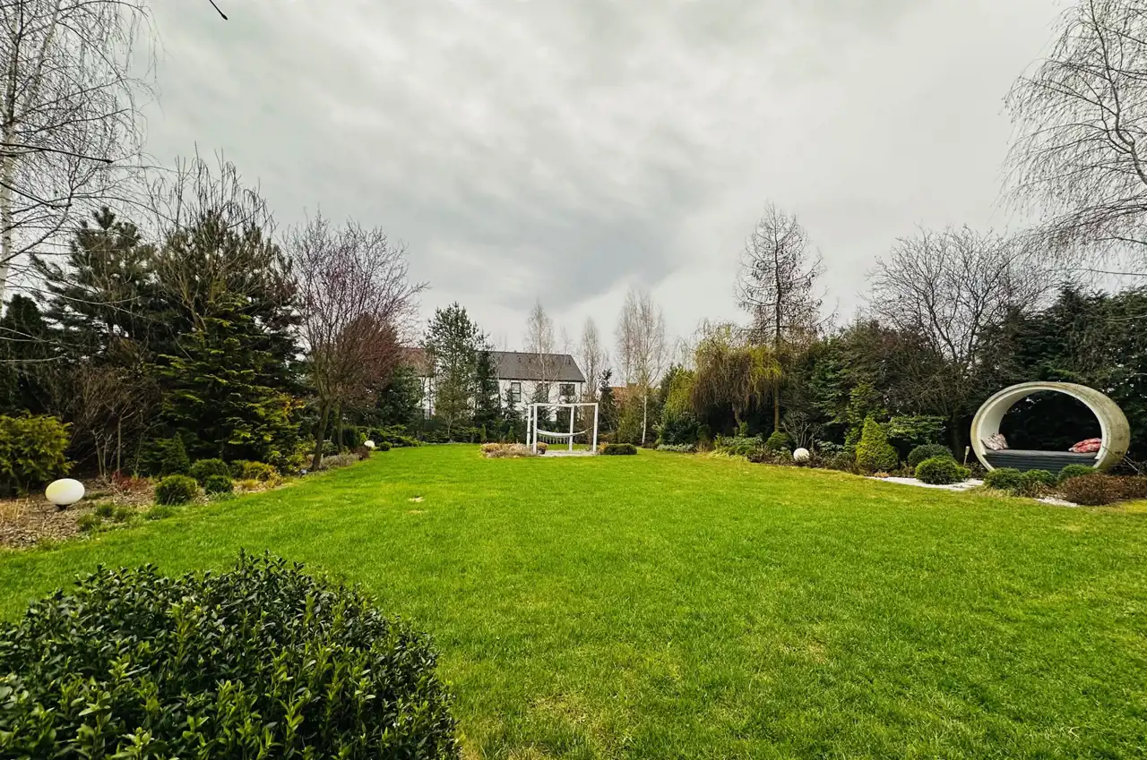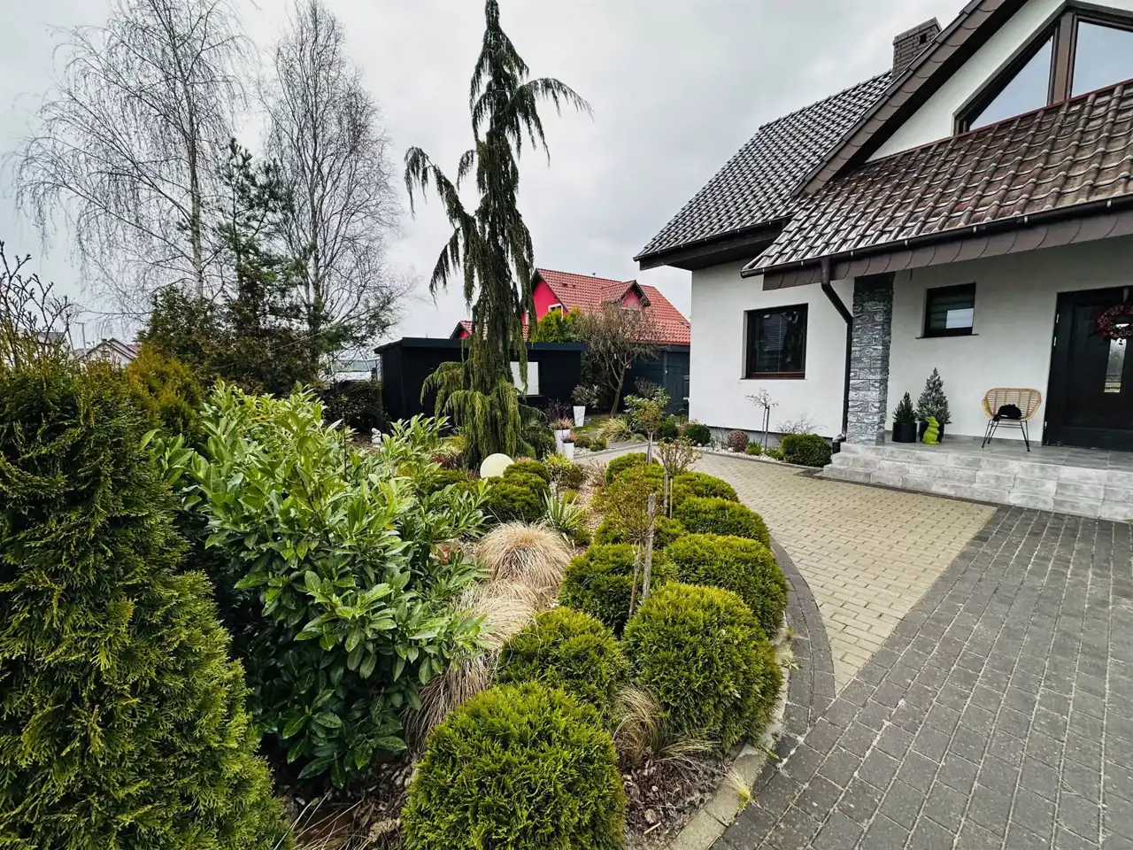 Przed domem wykostkowany podjazd, ogrodzenie metalowe od frontu, dookoła siatka, w ogrodzie dorodna roślinność. Zdjęcia jeszcze tego nie pokazują, ale niebawem będzie bujna przyroda dodająca klimatu i oferująca intymność. Na ogrodzie drewutnia, ogromny taras, miejsca wypoczynku. Liczne strawy, krzewy, dorodne drzewa. W ogrodzie system nawadniania i klimatyczne oświetlenie.