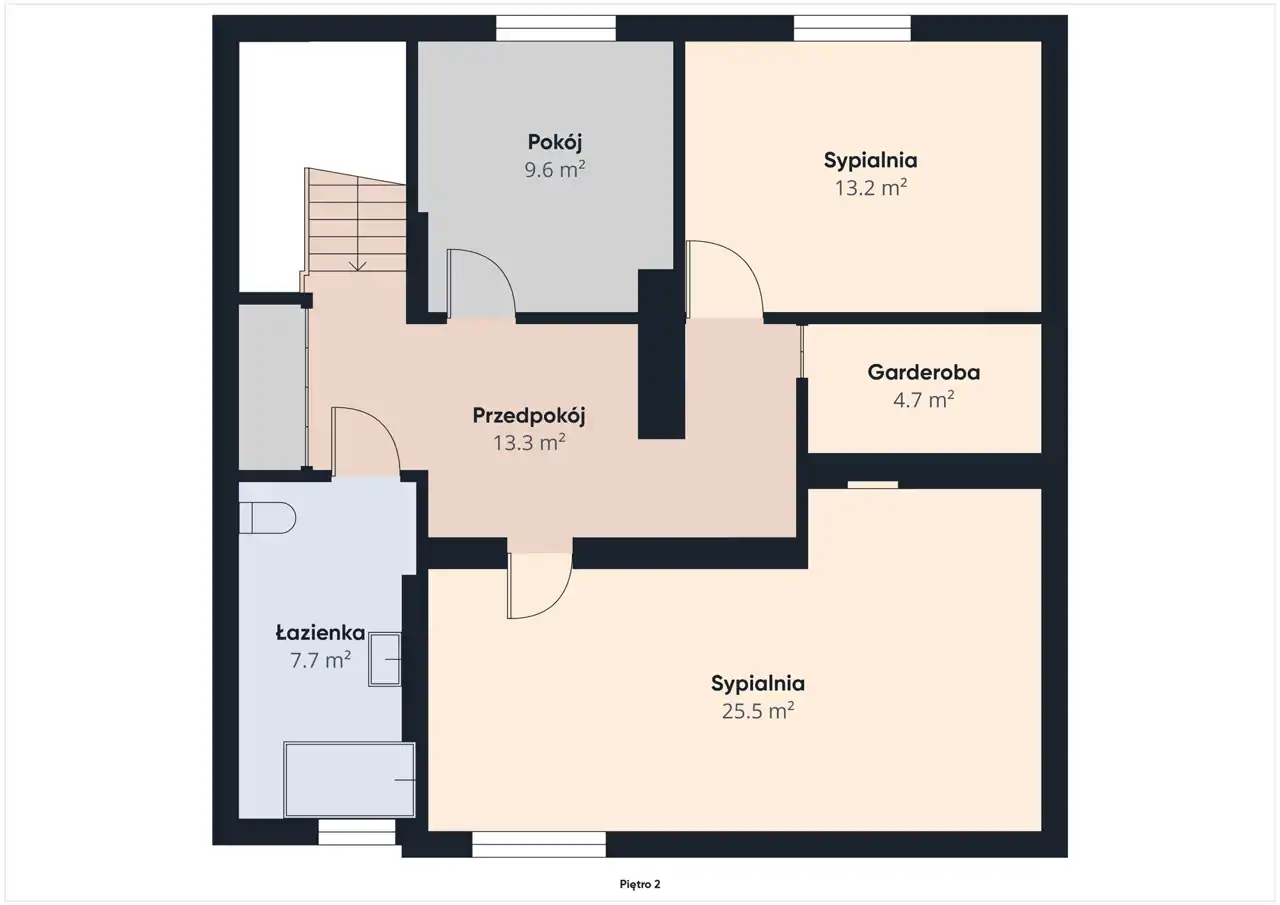 Drugie mieszkanie znajduje się na piętrze - pokój dzienny, kuchnia, sypialnia, łazienka, garderoba oraz na poddaszu - trzy sypialnie, garderoba, łazienka, komunikacja