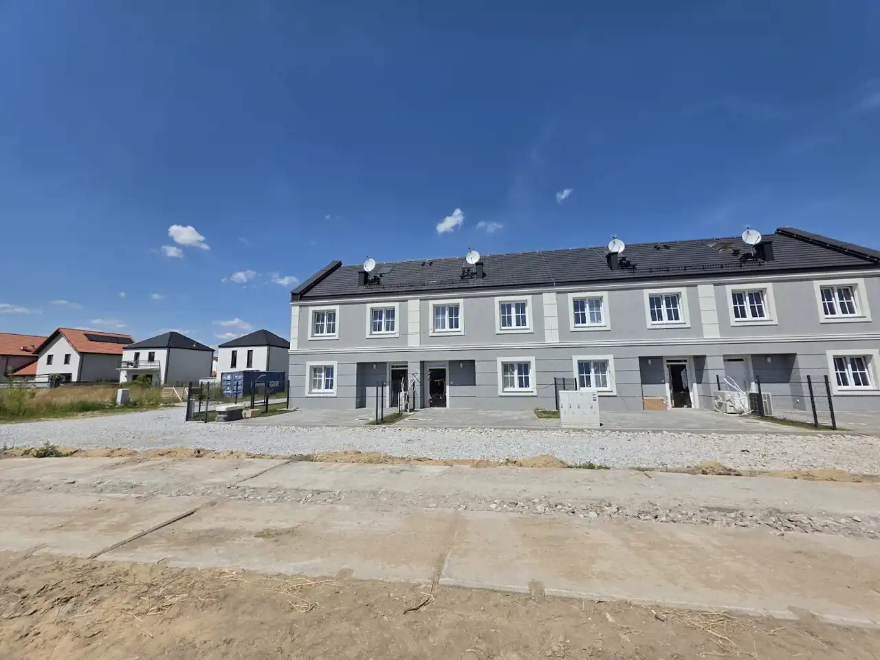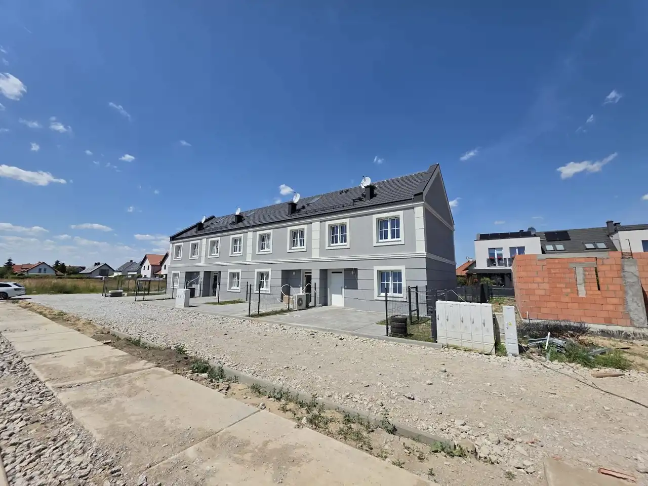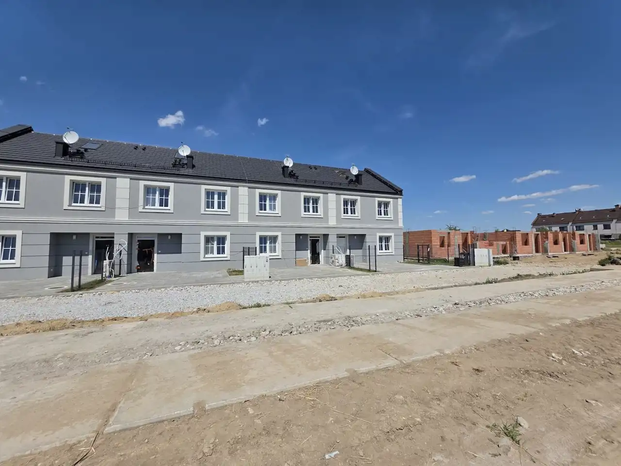 Teren: zniwelowany, ogrodzony trójstronnie, trawnik z siewu, taras z płyty betonowej. Dwa miejsca parkingowe przed budynkiem.