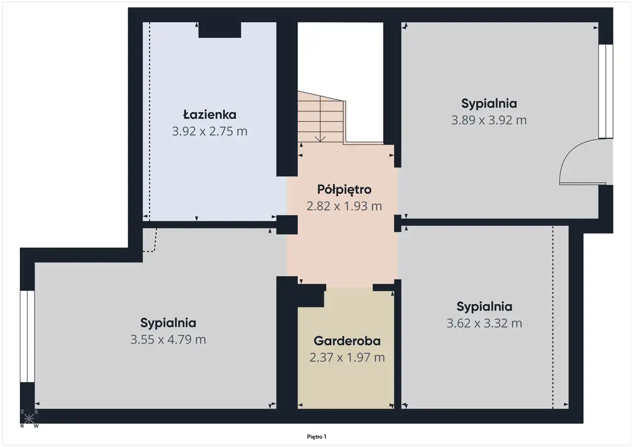 - Piętro (57,08 m²): Trzy Sypialnie (największa 16,44 m²), duża Łazienka (7,07 m²) oraz komfortowa Garderoba (5,58 m²).
