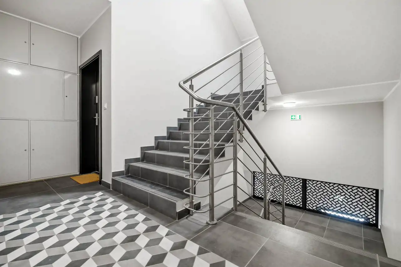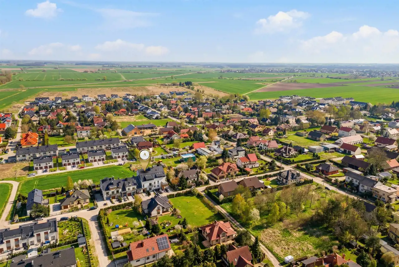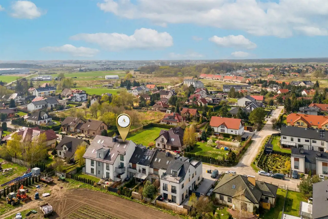 Mieszkanie znajduje się na pierwszym piętrze w dwupiętrowym budynku wzniesionym w 2023 roku pośród kameralnej zabudowy domów jednorodzinnych.