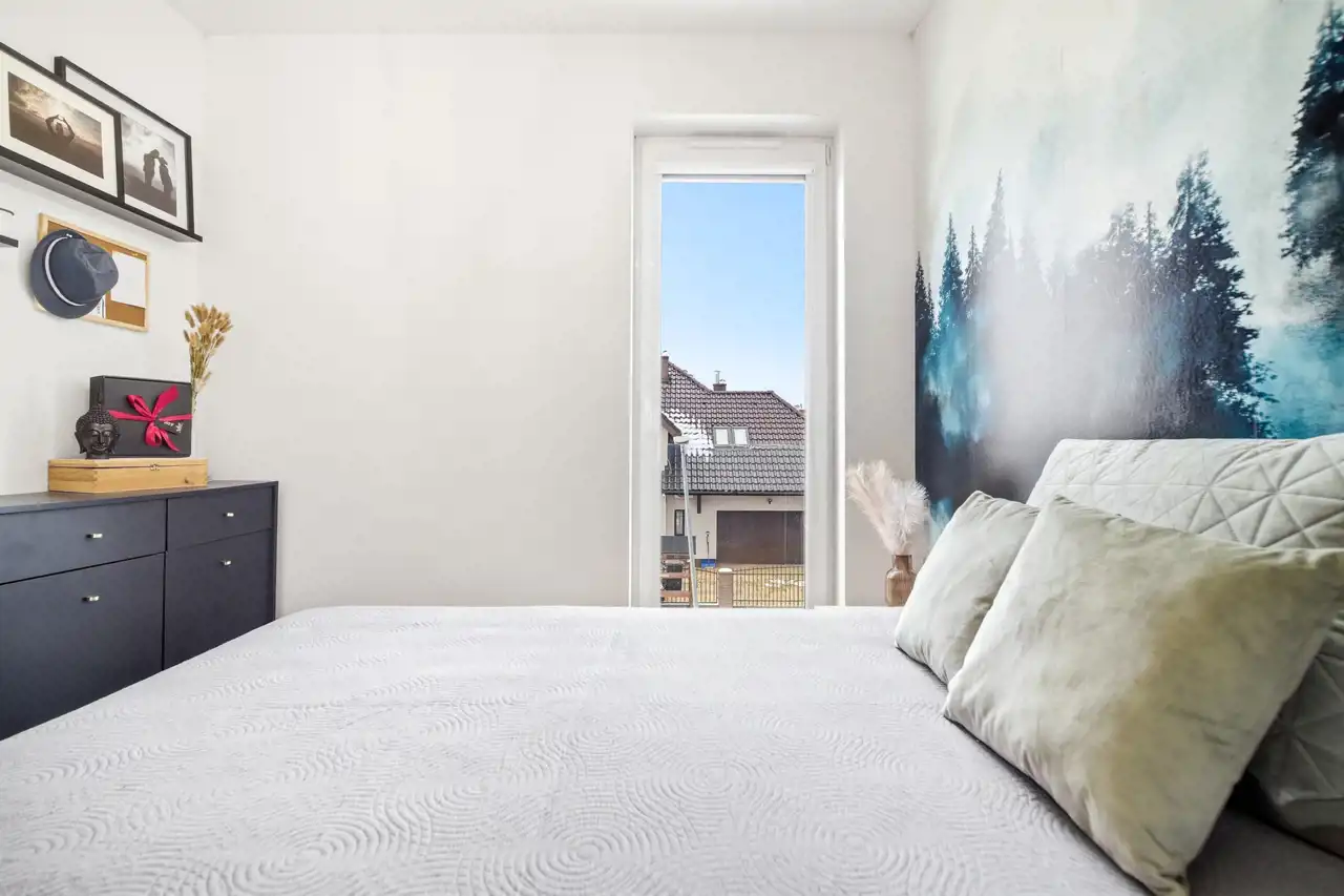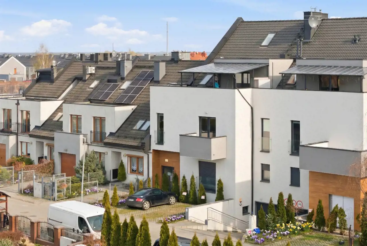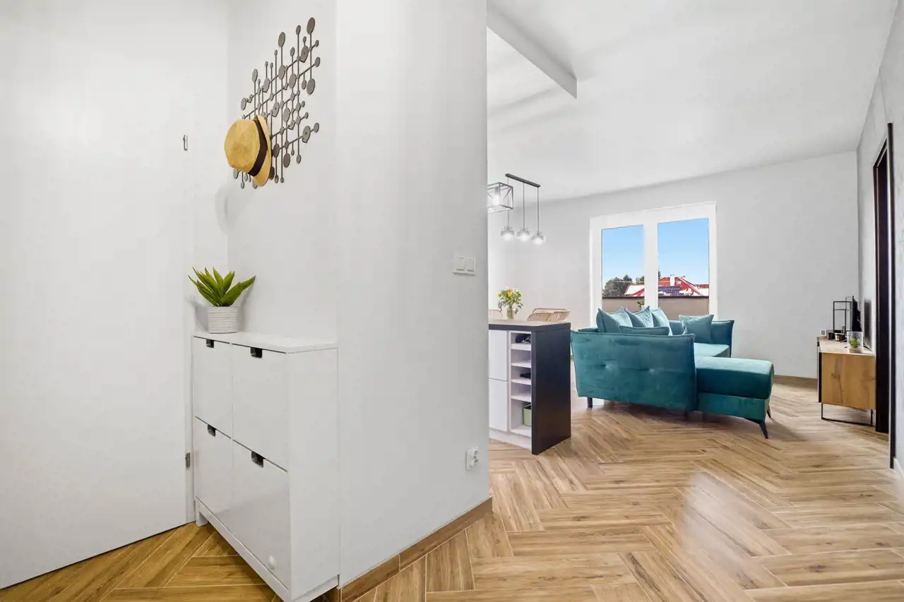 Mieszkanie znajduje się na pierwszym piętrze w dwupiętrowym budynku wzniesionym w 2023 roku pośród kameralnej zabudowy domów jednorodzinnych.