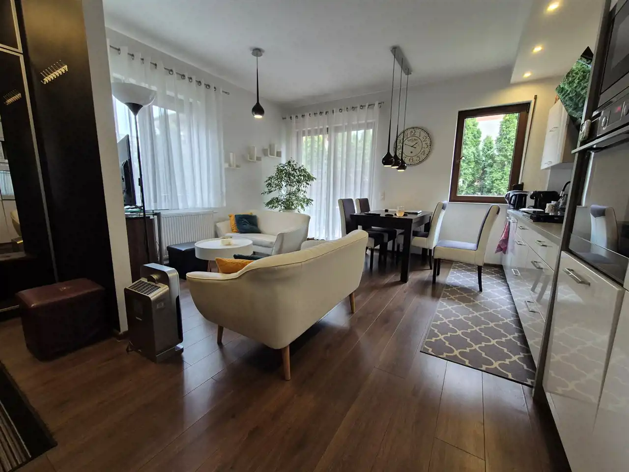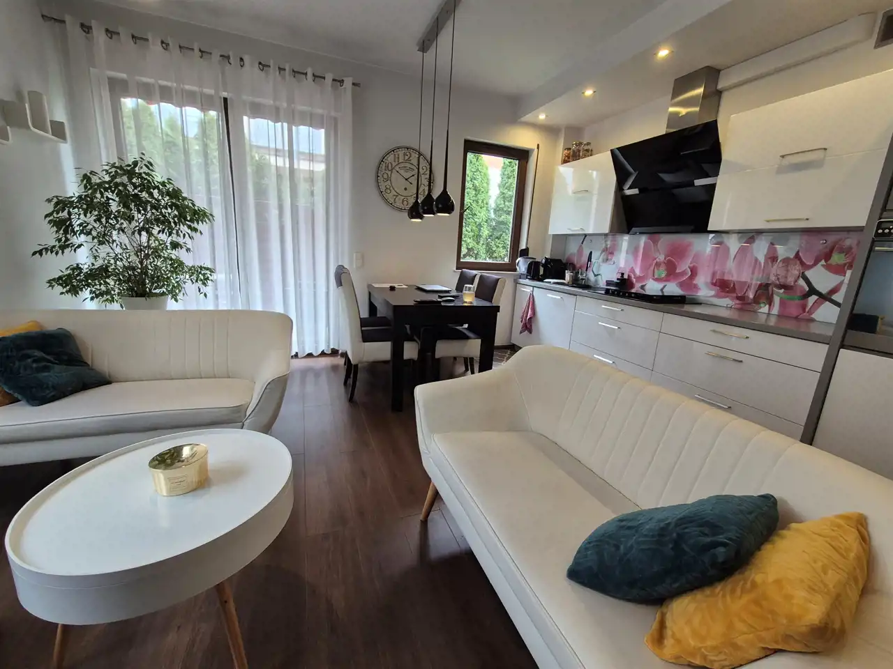 Pokój dzienny z aneksem kuchennym o pow. 22,30 m2 z wyjściem na taras i ogród.