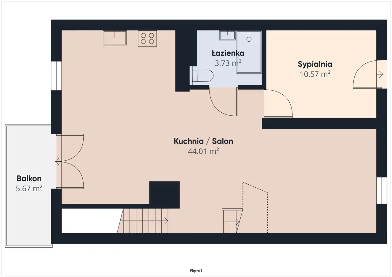 Przestronna część dzienna: salon z aneksem kuchennym i jadalnią
