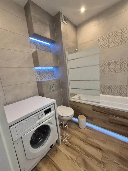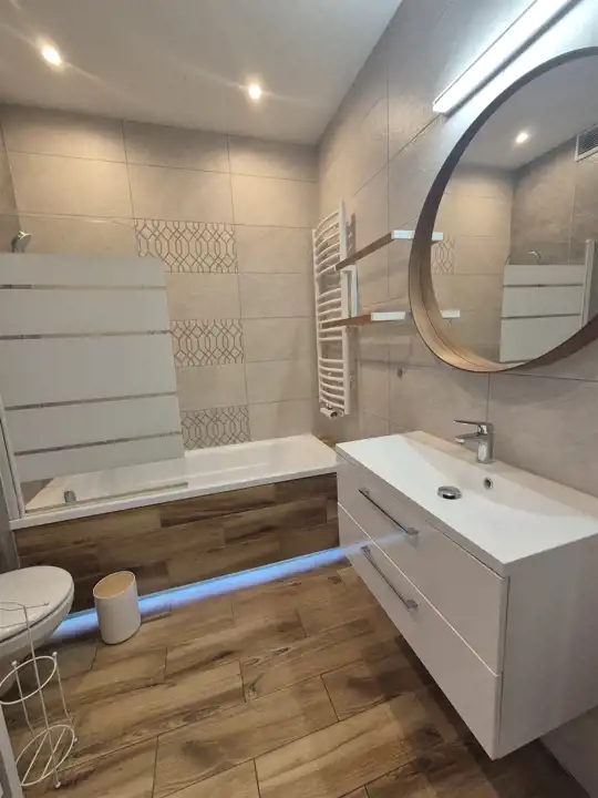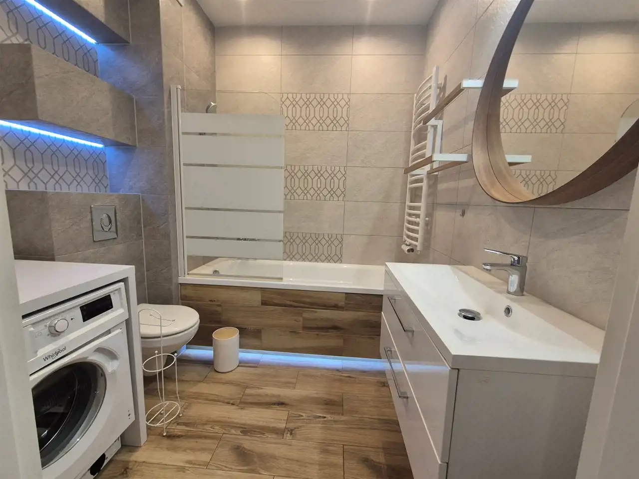 Przepiękna łazienka razem z wc z wanną i parawanem z możliwością prysznica.
