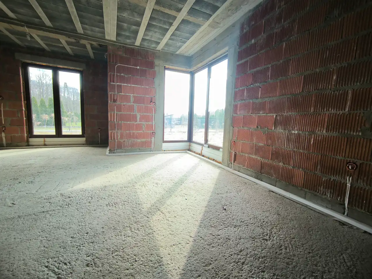 Dom znajduje się w stanie surowym zamkniętym, co daje możliwość wykończenia wnętrz według własnego gustu i potrzeb. Budynek wykonany z wysokiej jakości pustaka ceramicznego, z solidnymi betonowymi stropami. Zastosowano nowoczesne, energooszczędne okna 3-szybowe w dwustronnym kolorze.