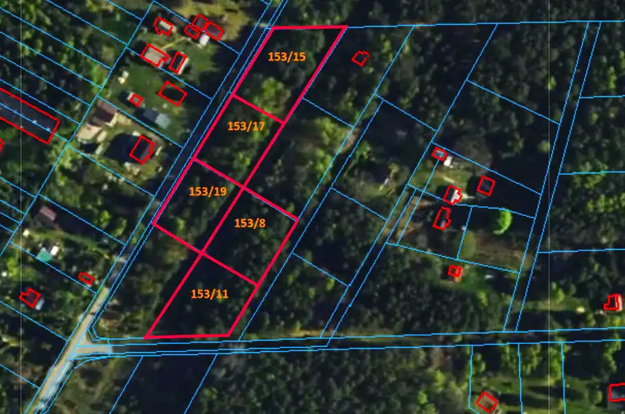 153/8 1283 m.kw - prostokąt: 39 m (front), dojazd drogą gruntową, zalesiona,
