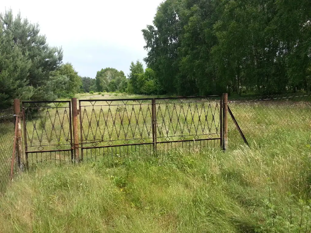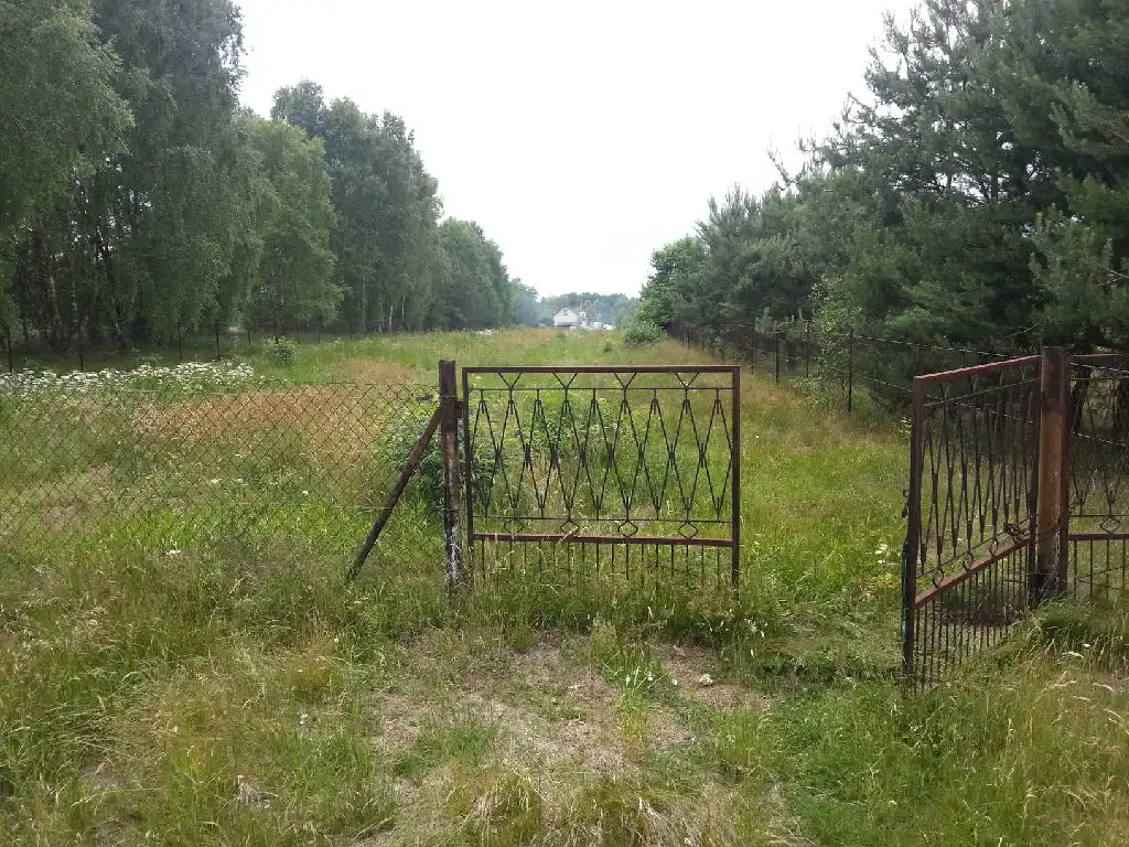 Teren częściowo ogrodzony dookoła siatką, na froncie i z tyłu brama z furtką.