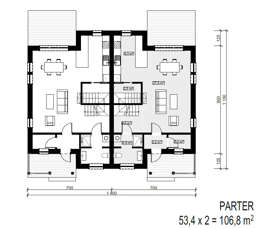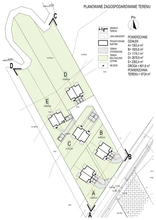 Nieruchomość stanowi bardzo ciekawą propozycję dla dewelopera. Projekt zagospodarowania terenu przewiduję część budowlaną znajdującą się od strony drogi asfaltowej o powierzchni około 5000 m2, na której wstępny projekt zakłada możliwość wybudowania 5 domów typu bliźniak. Usytuowanie projektowanych budynków umożliwia maksymalne wykorzystanie dostępnej powierzchni przy jednoczesnym zagwarantowaniu niezależności i komfortu dla mieszkańców. Według projektu budynki zasilane byłby wodą ze studni głębinowej, natomiast ogrzewane, ze względu na sprzyjające temu warunki, za pomocą głębinowej pompą ciepły.
