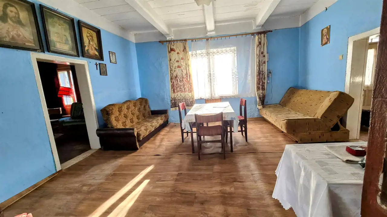 Na terenie działki o powierzchni 3800 m² znajduje się drewniany dom z bali, obity deskami, z dobudowaną częścią murowaną. Budynek o powierzchni ok. 80 m² obejmuje dwa przestronne pokoje, kuchnię oraz dodatkowe pomieszczenie z możliwością adaptacji według indywidualnych potrzeb. Nieruchomość uzupełniają zabudowania gospodarcze, które można wykorzystać na cele rekreacyjne, warsztatowe lub magazynowe.