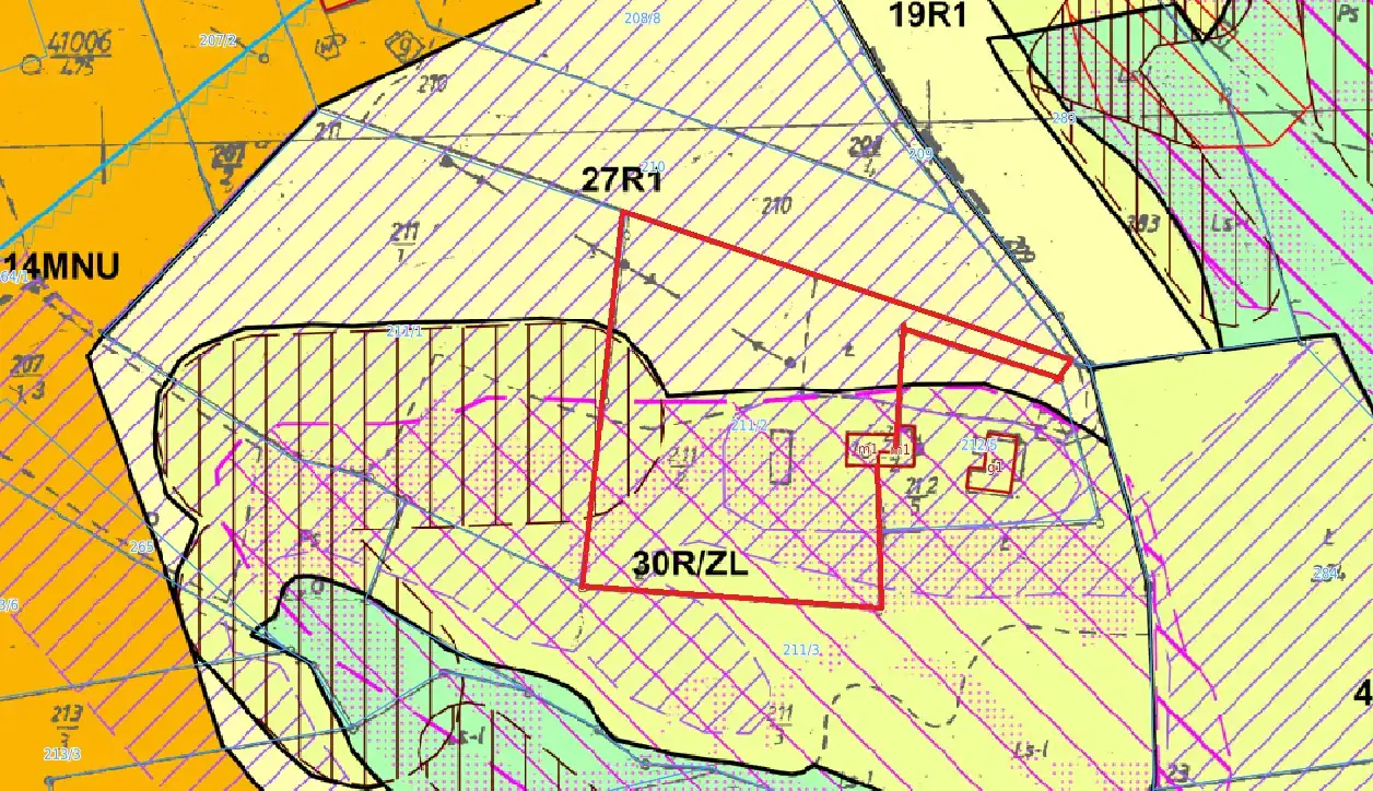 Nieruchomość objęta jest miejscowym planem zagospodarowania przestrzennego z oznaczeniami "27R1" (tereny gruntów rolnych) oraz "30R/ZL" (tereny gruntów rolnych z możliwością zalesienia).