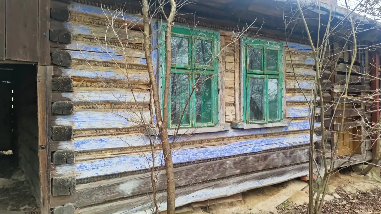 Drewniany dom o powierzchni zabudowy 76 m², wymagający kapitalnego remontu.