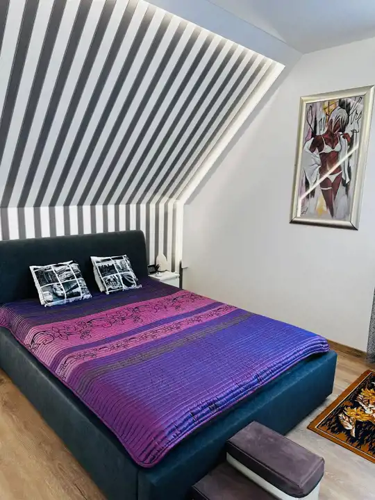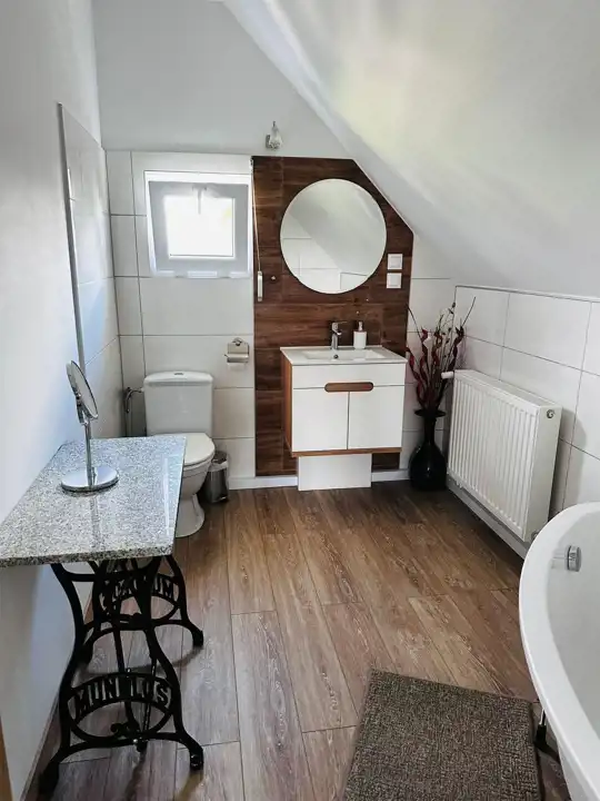 Poddasze mieści sypialnię, pokój dzienny oraz drugą łazienkę (z wanną).