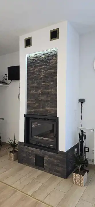 Ogrzewanie centralne (przygotowane w 90%); przewidziane dwa źródła ciepła - wysoce wydajny kominek opalany biomasą oraz instalacja fotowoltaiczna. Ciepła woda użytkowa uzyskiwana za pomocą bojlera elektrycznego o pojemności 80 litrów.