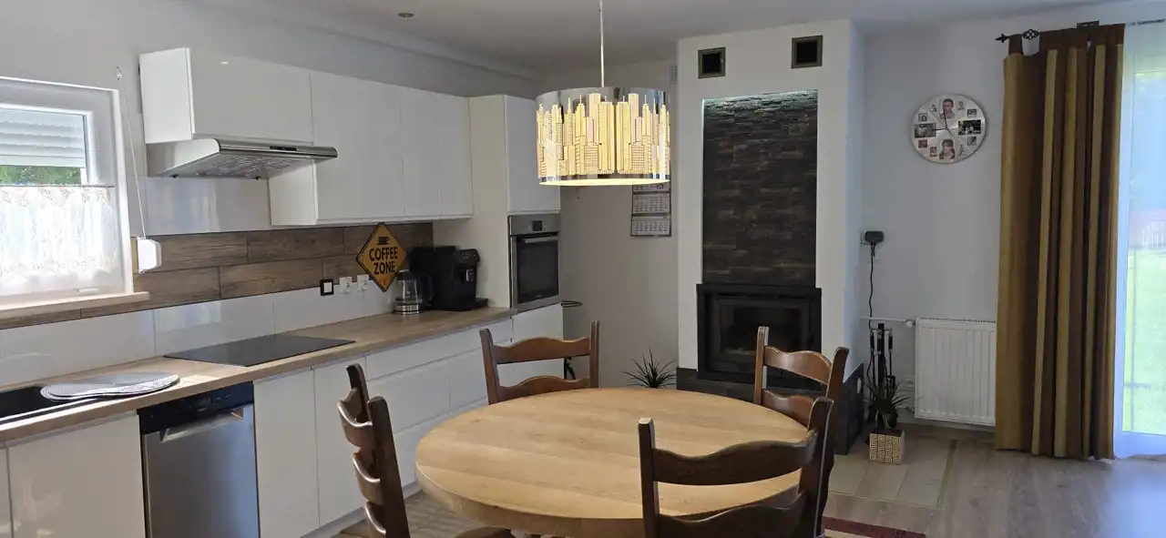 Dom wybudowany w konstrukcji szkieletowej w 2020r., dach kryty blachą trapezową w kolorze grafitowym wykonaną z wysokogatunkowej stali. Stolarka okienna PCV, w oknach zamontowane rolety antywłamaniowe renomowanej firmy ALUPROF. Na podkreślenie zasługuje bardzo dobra izolacja termiczna budynku, której rezultatem jest minimalne zapotrzebowanie energii na jego ogrzanie. Ściany od wewnątrz ocieplone zostały wełną mineralną o grubości 15cm, na zewnątrz styropianem o grubości 10cm, skosy ocieplone wełną mineralną. Budynek wyposażony w nowoczesne rozwiązania; m.in. insatalację alarmową i monitoring oraz OZE, takie jak panele fotowoltaiczne czy wiatrak z mocą 5 KW. W budynku wykonano także system akumulacji energii o mocy 6KW pozwalający na podtrzymanie napięcia w niektórych urządzeniach w przypadku braku zasilania z sieci energetycznej.
