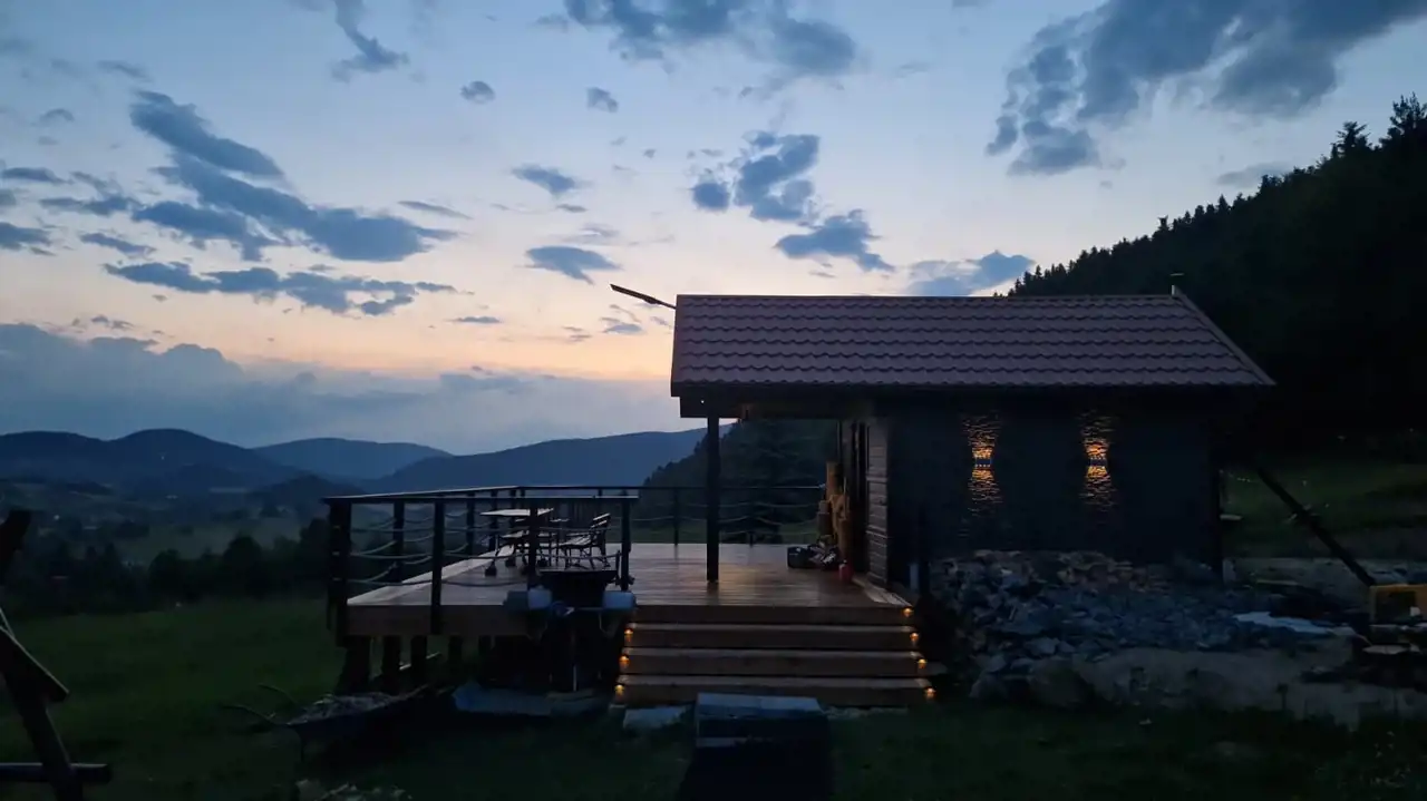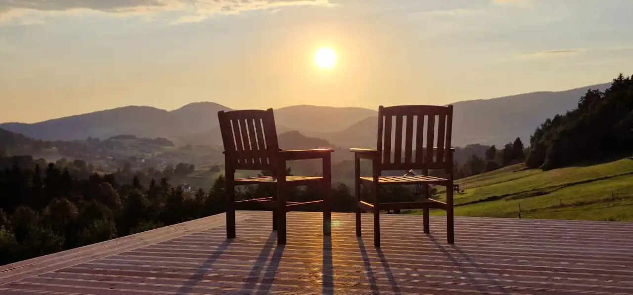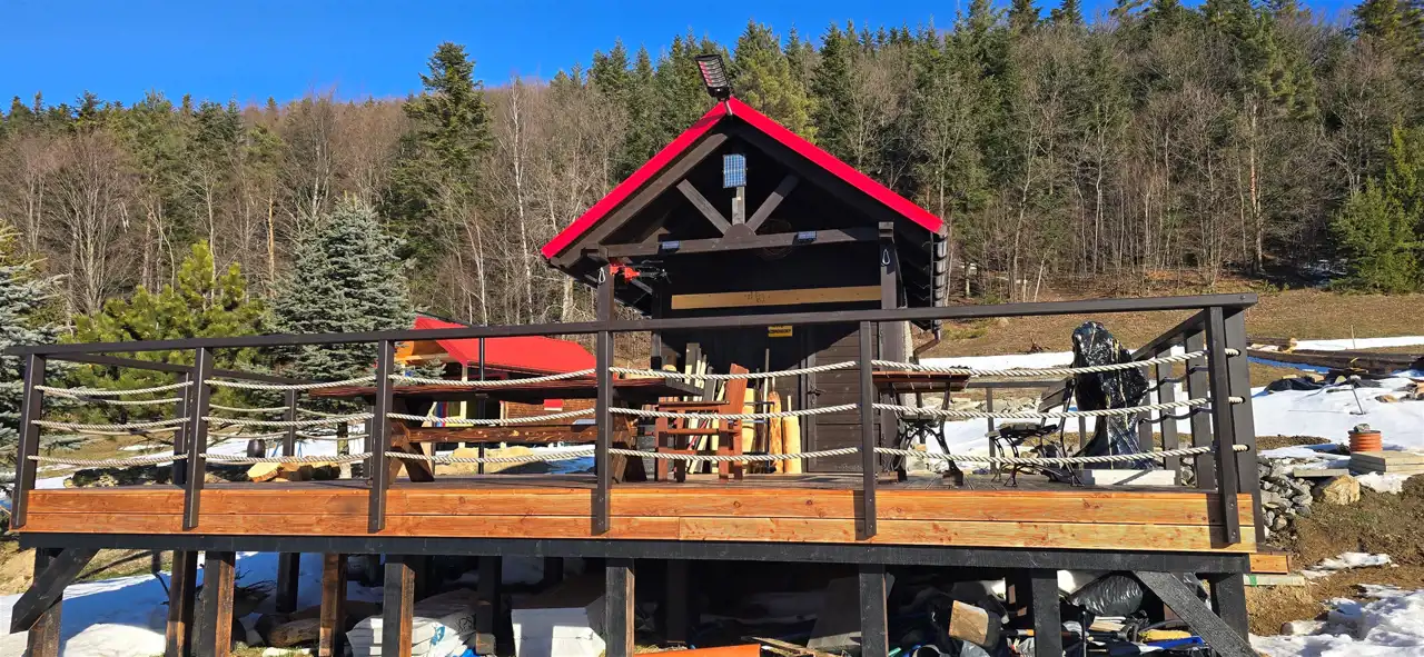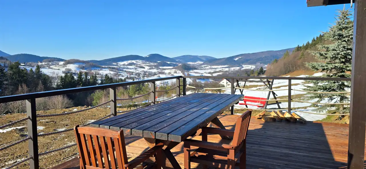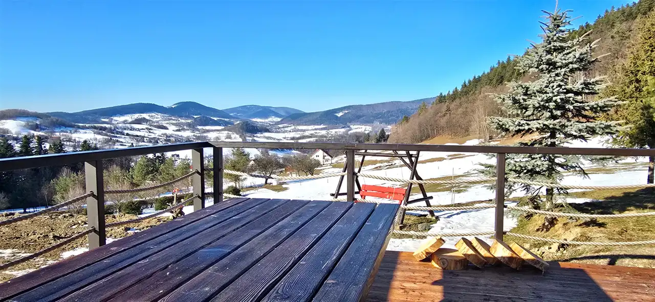 Jeden z istniejących domków posiada imponujący taras widokowy o powierzchni ok. 40 m² – to właśnie tutaj spędza się najwięcej czasu, a widoki jakie się z niego roztaczają zapierają dech w piersiach o każdej porze roku.