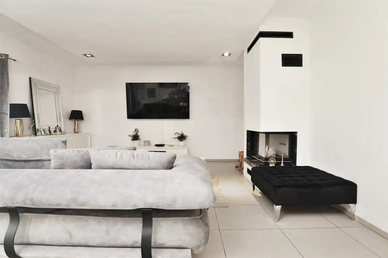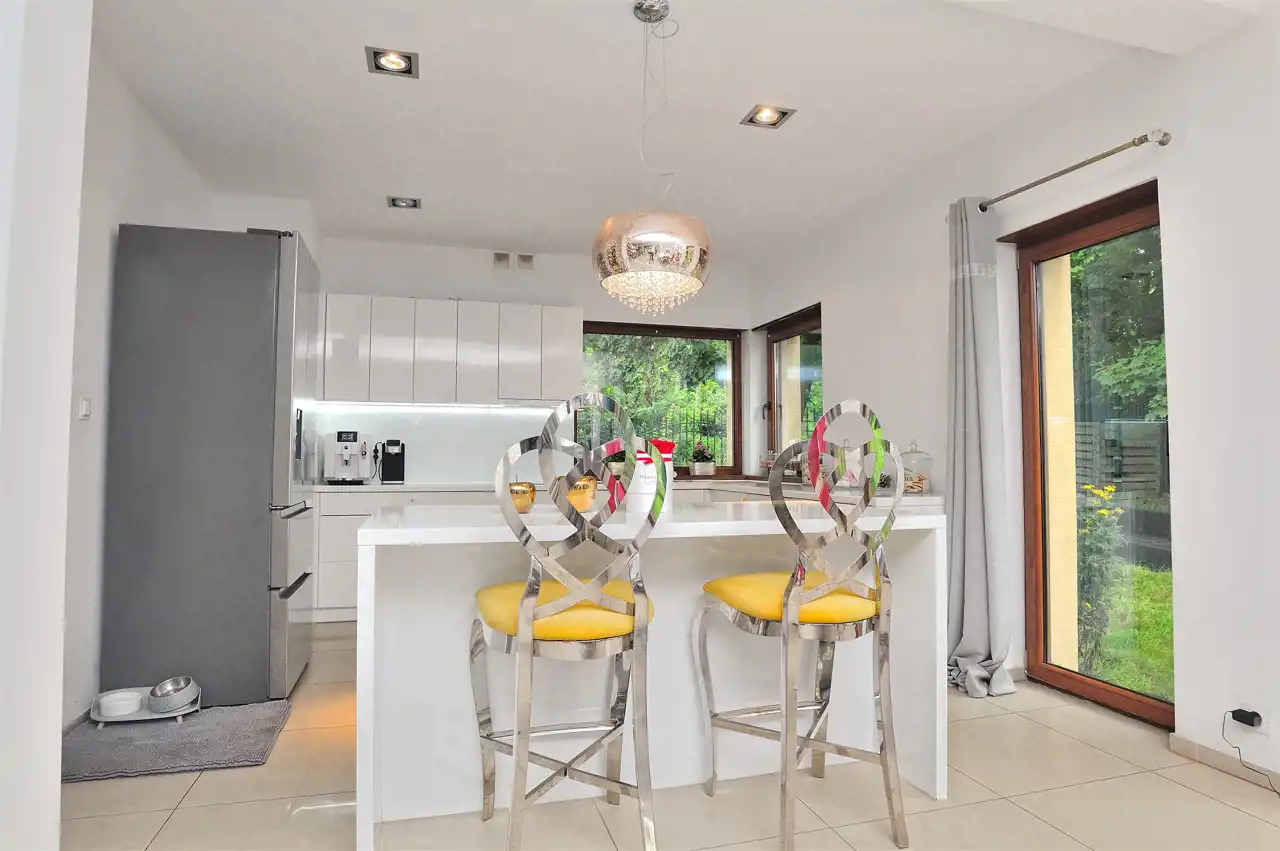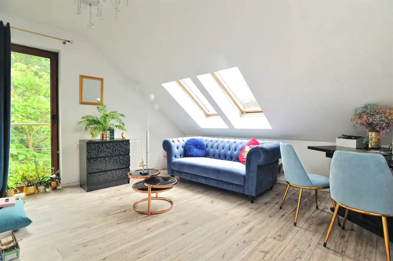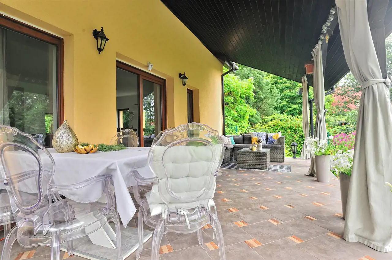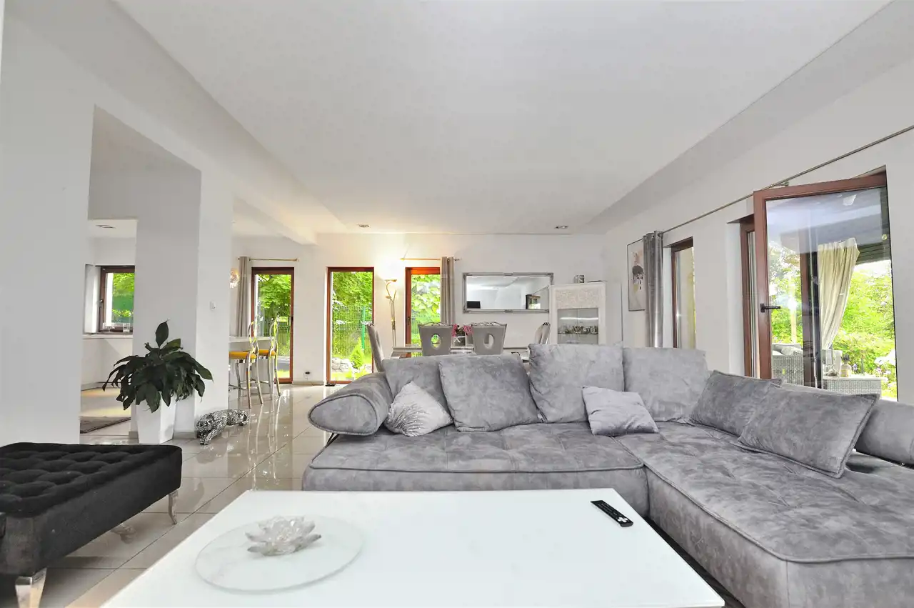 Przestronny, jasny salon z wyjściem na zadaszony taras od strony południowej