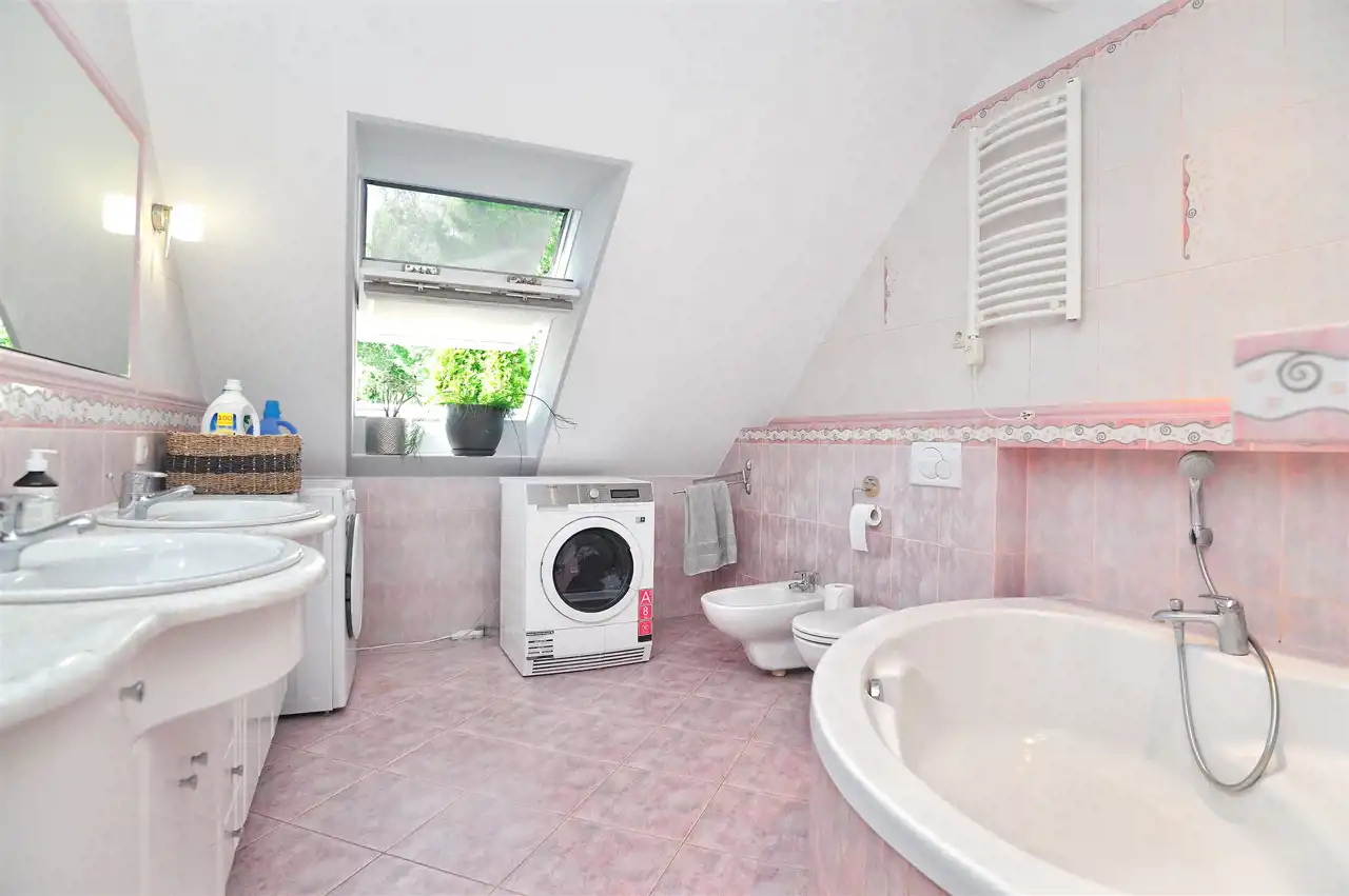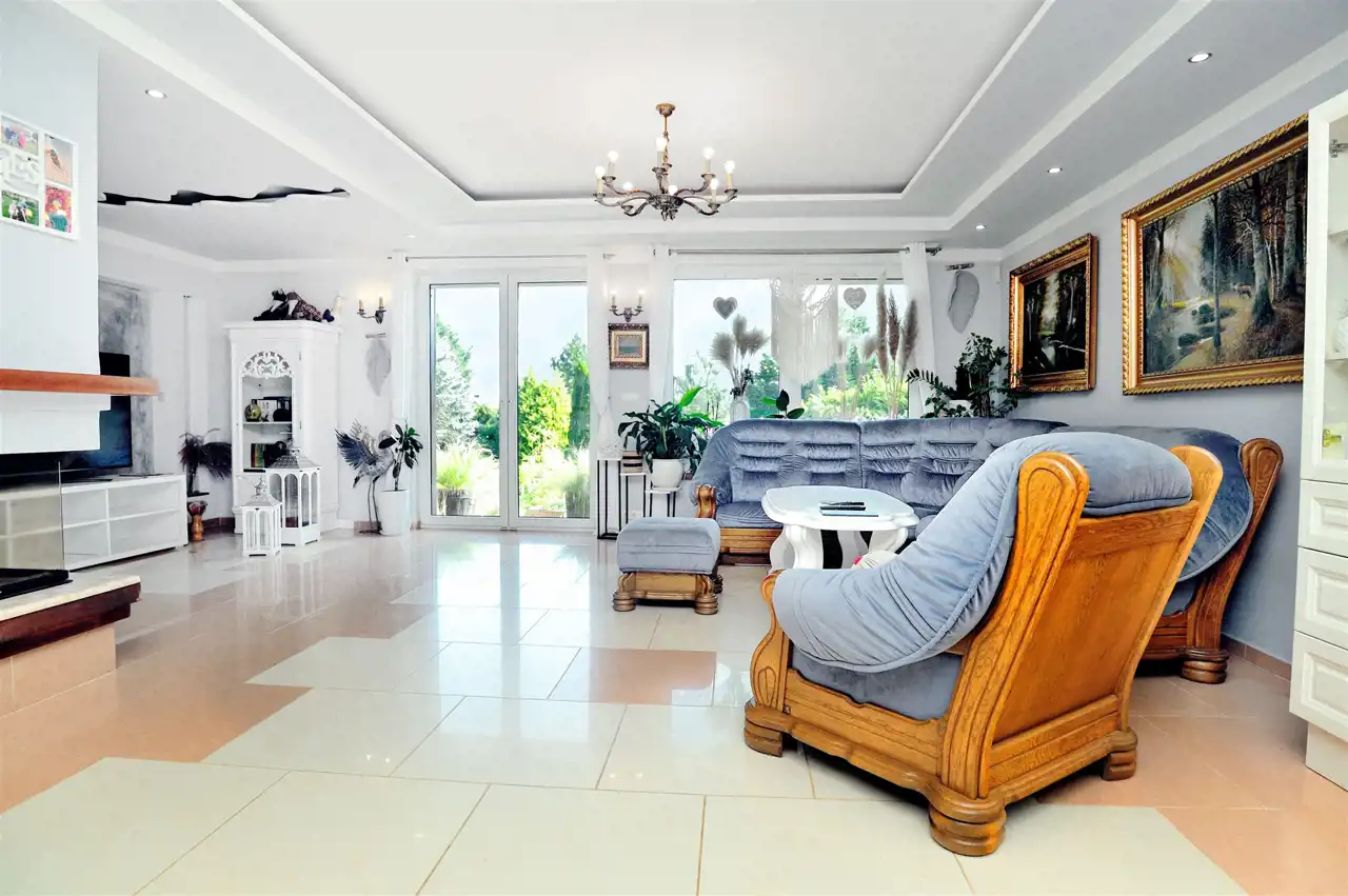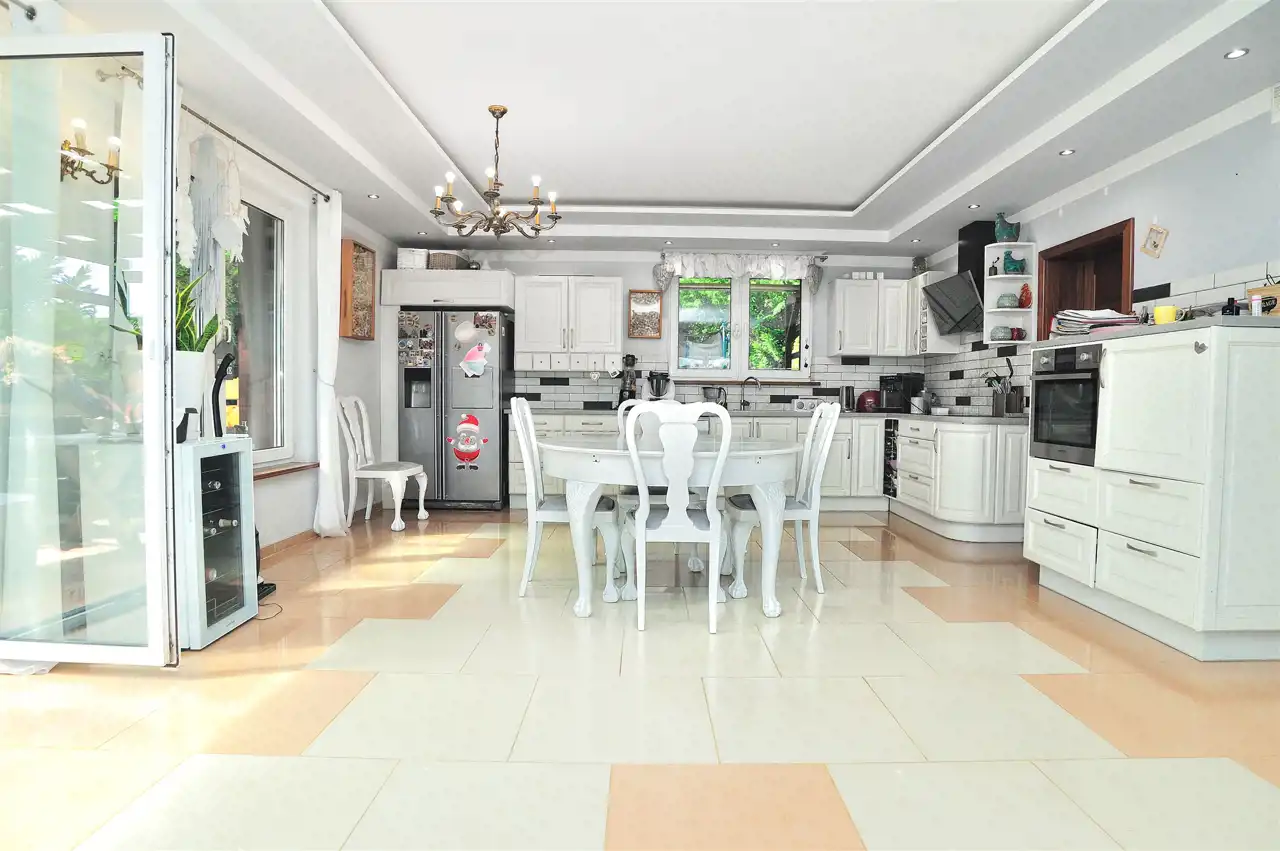 Na parterze znajduje się przestronny 80 m2 salon z kominkiem, połączony z jadalnią i w pełni wyposażoną kuchnią, spiżarnią, gabinet i garaż dwu stanowiskowy.