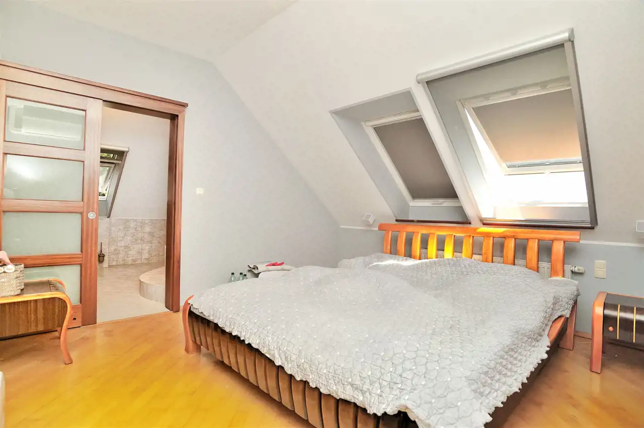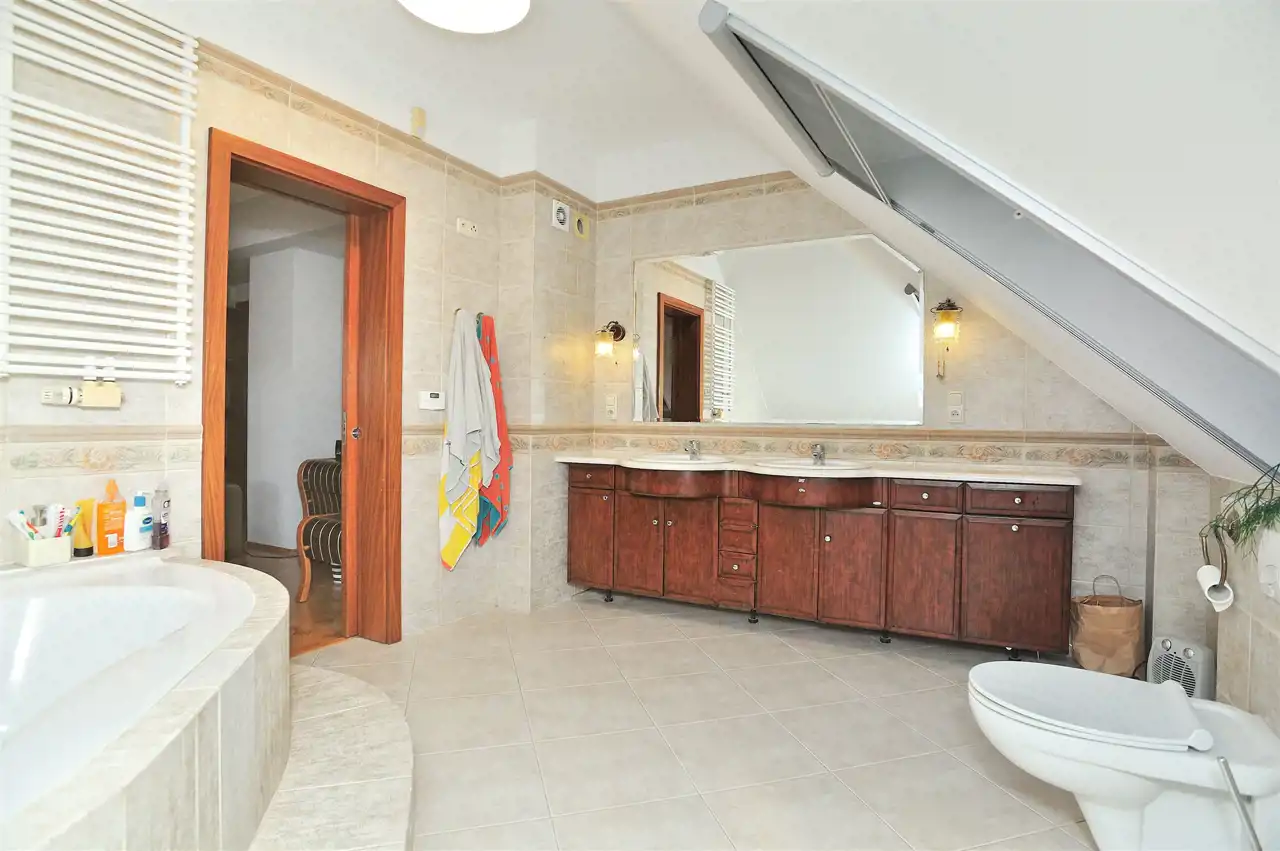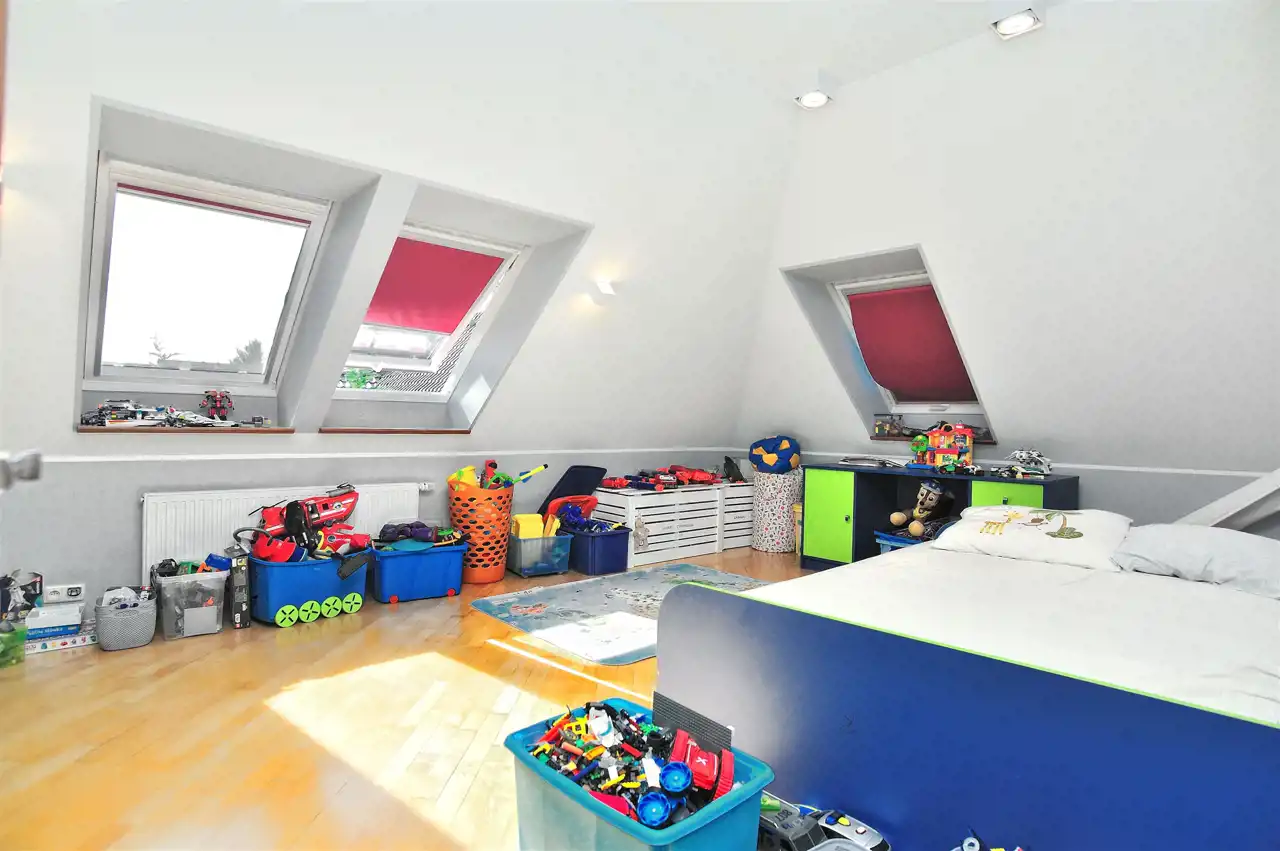 Na piętrze znajduje się pięć sypialni, w tym główna sypialnia z własną łazienką i garderobą, oraz dodatkowa łazienka.