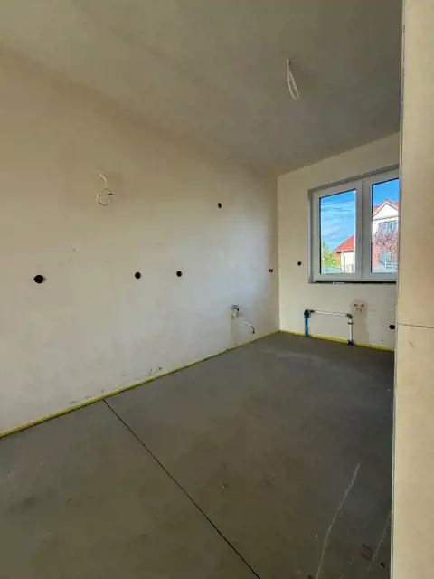 Wewnątrz tynki gipsowe, przygotowane do malowania.