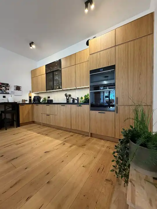 • zabudowa na wymiar – Rawa Meble, fronty z naturalnego forniru dębowego