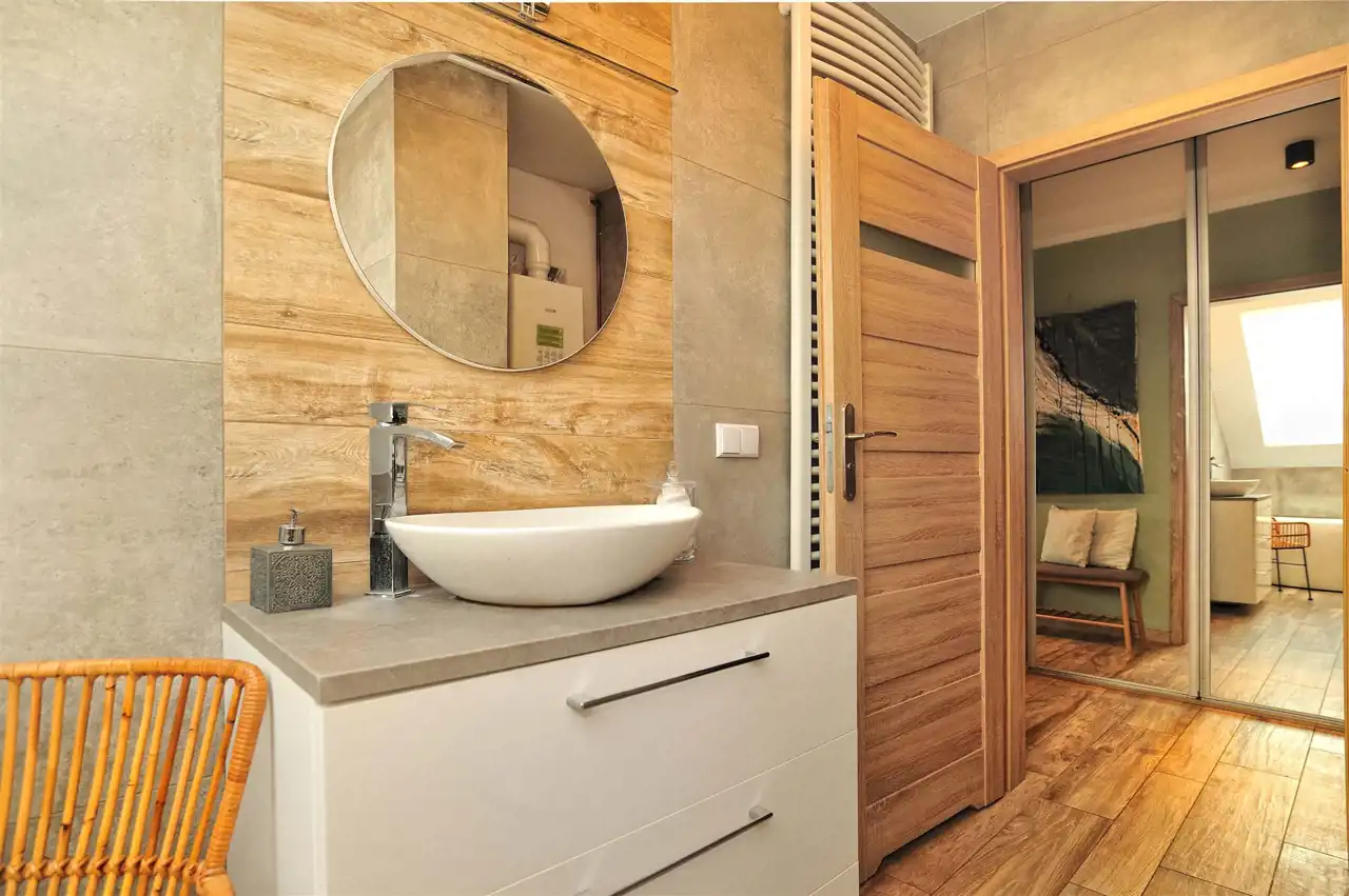 Łazienka widna, z wanną wolnostojącą, całość utrzymana w kolorystyce jasnych szarości oraz drewnopodobnej posadzki w postaci gresu.