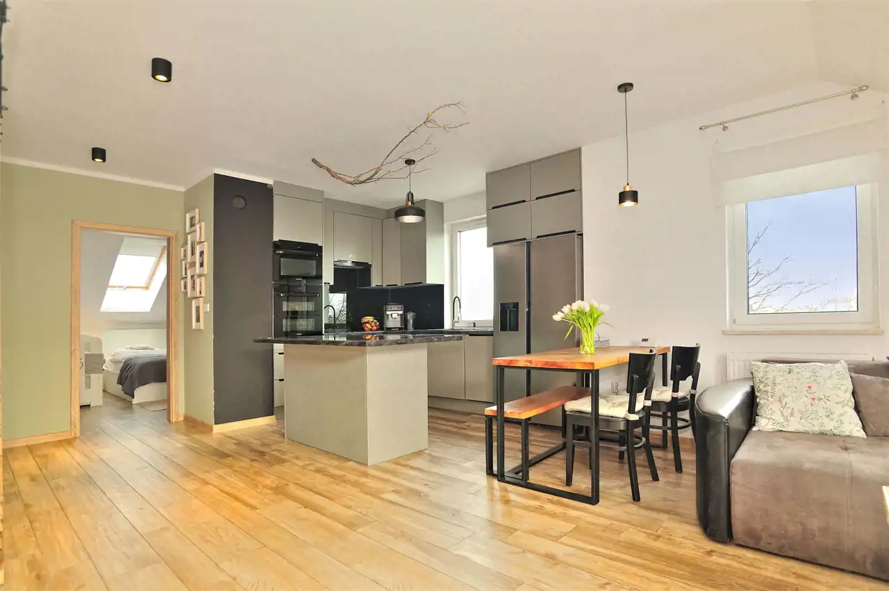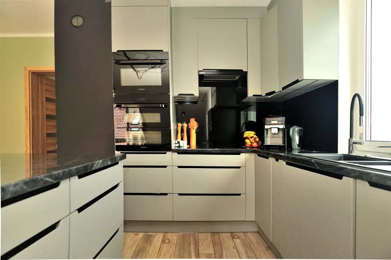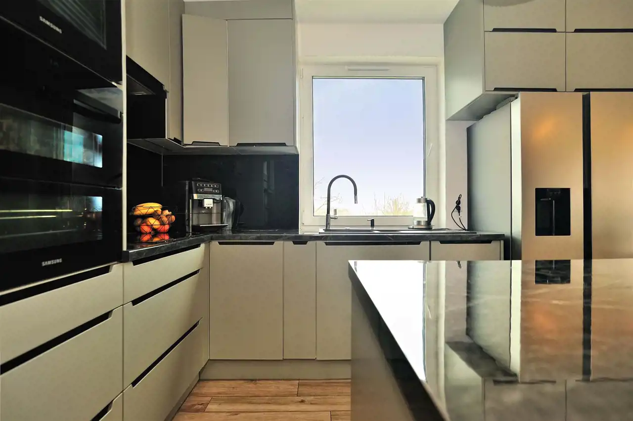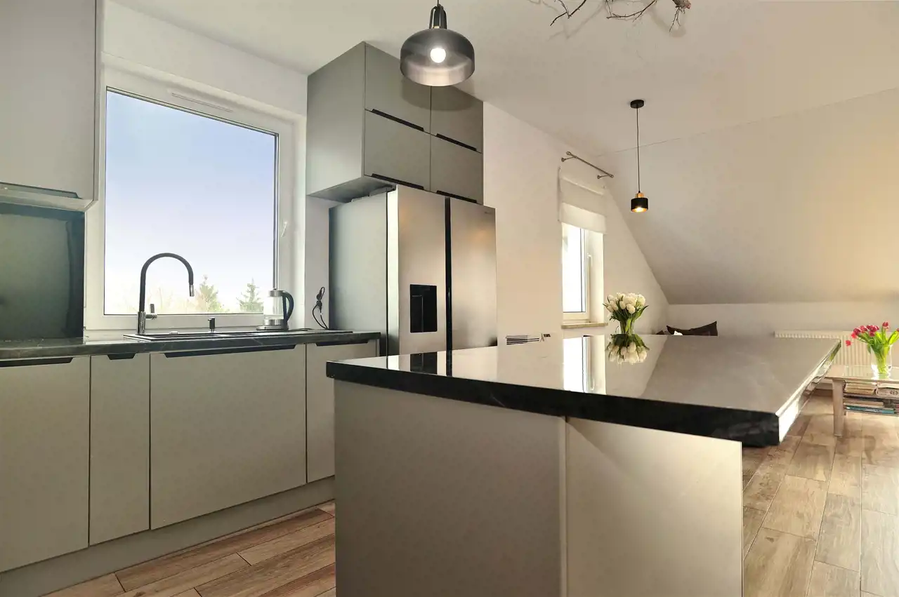 Salon łączy się z aneksem kuchennym, który scala wyspa. Meble kuchenne wysoki połysk, utrzymana w kolorystyce szarości, blaty kamienne. Zabudowa kuchenna z pełnym wyposażeniem w sprzęty agd, wykonana na zamówienie. Duża powierzchnia blatu roboczego.