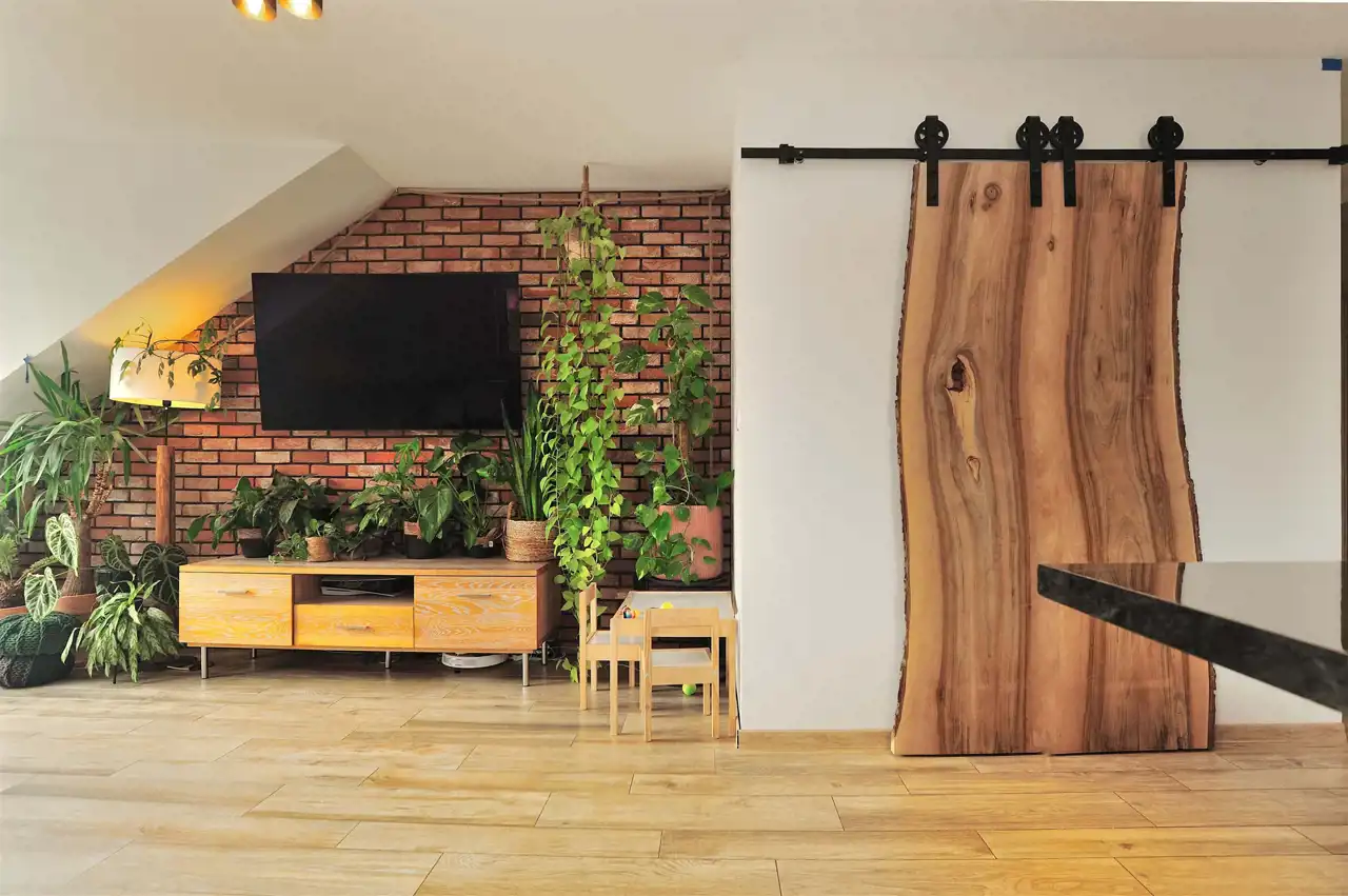 Przestrzeń za nietypowymi oraz oryginalnymi jednocześnie skrzydłami drzwiowymi z drewna, stanowi dodatkowe miejsce do przechowywania.