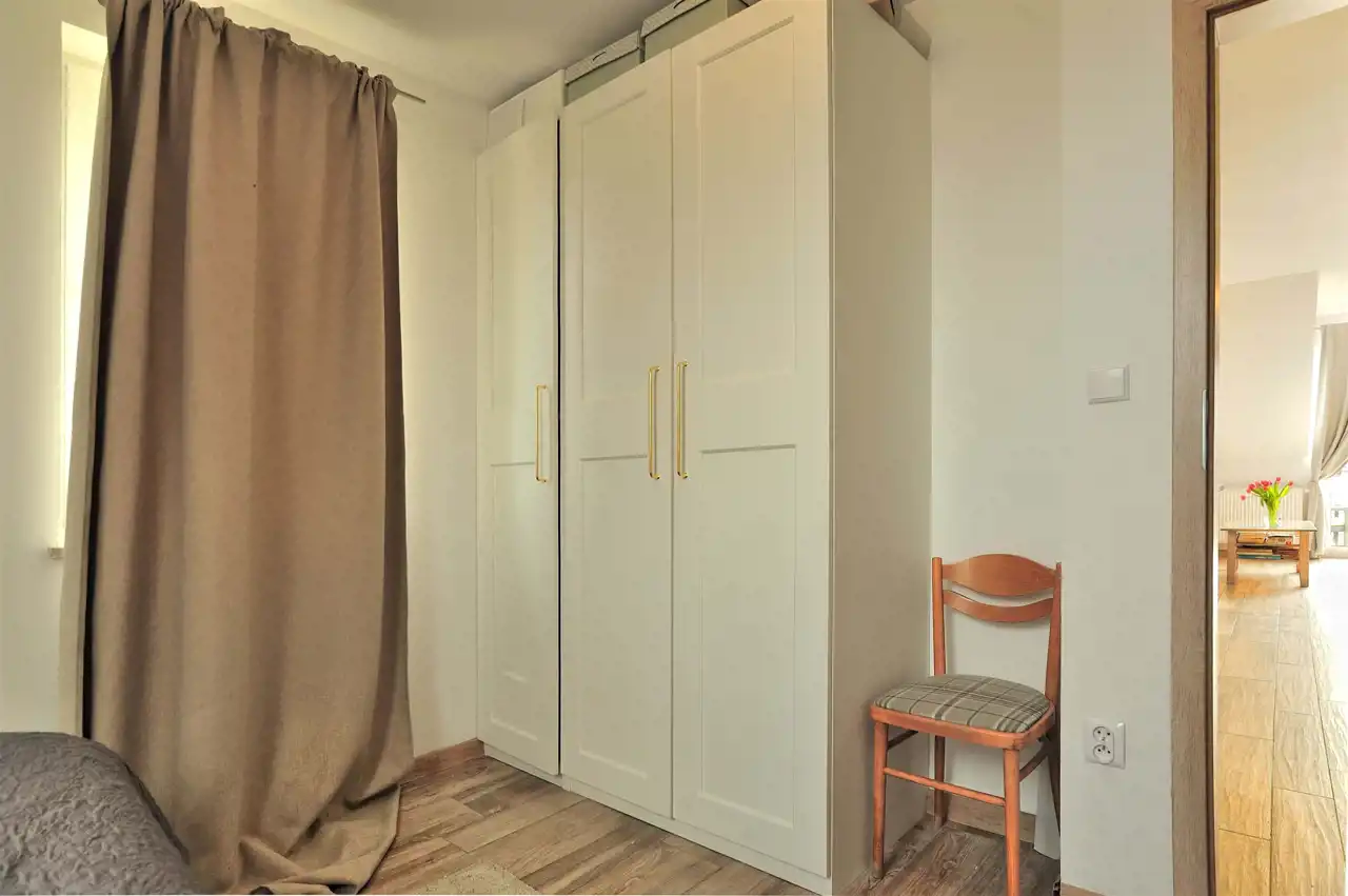Na przestrzeń mieszkania składa się część komunikacyjna z dużą zabudową szafy garderobianej wykonaną na zamówienie, dwie sypialnie, łazienka, pomieszczenie gospodarcze (oddzielna garderoba) oraz salon z aneksem kuchennym. Z salonu wyjście na kameralny, przytulny balkon.