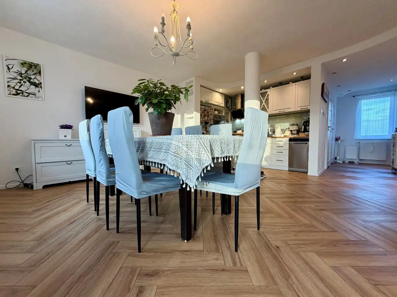 Nieruchomość o powierzchni 91 m² wyróżnia się przemyślanym układem pomieszczeń oraz dużą ilością naturalnego światła – mieszkanie jest dwustronne i rozkładowe.