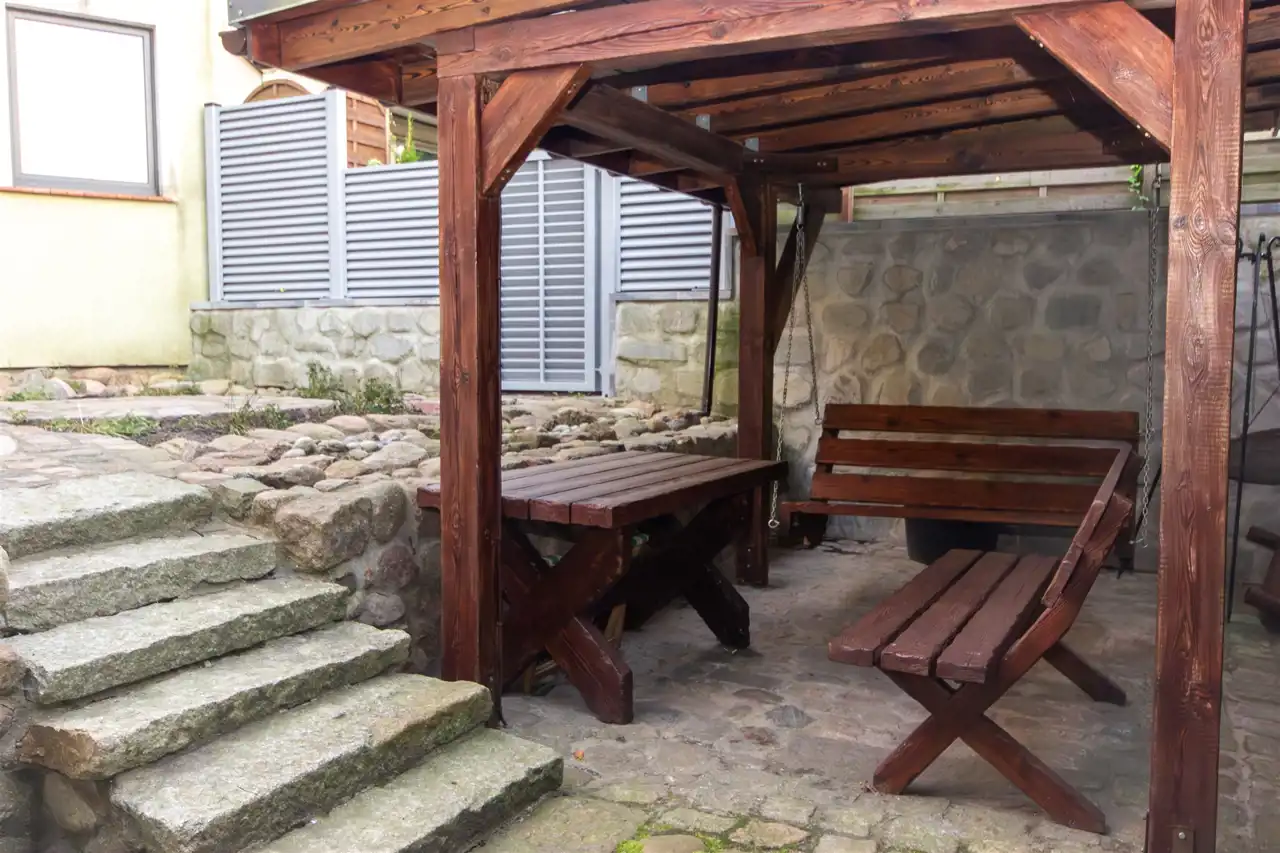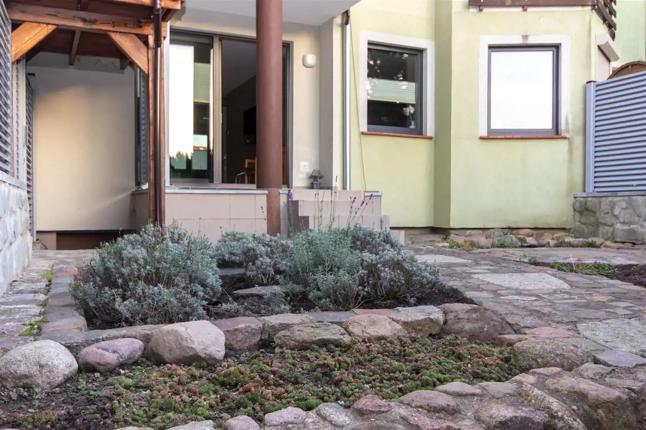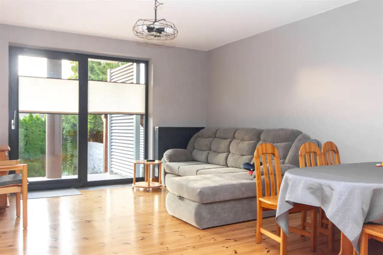 Na powierzchnię mieszkania składa się kuchnia w zabudowie , wyposażona w sprzęt AGD - pralka, suszarka, zmywarka, kuchenka, okap, piekarnik. Wydzielona jadalnia , oraz salon z wyjściem na taras i do ogrodu. Łazienka razem z wc, gdzie znajduję się wanna, toaleta, oraz miejsce gdzie znajduję się piec gazowy- dwuobiegowy.