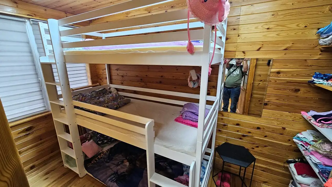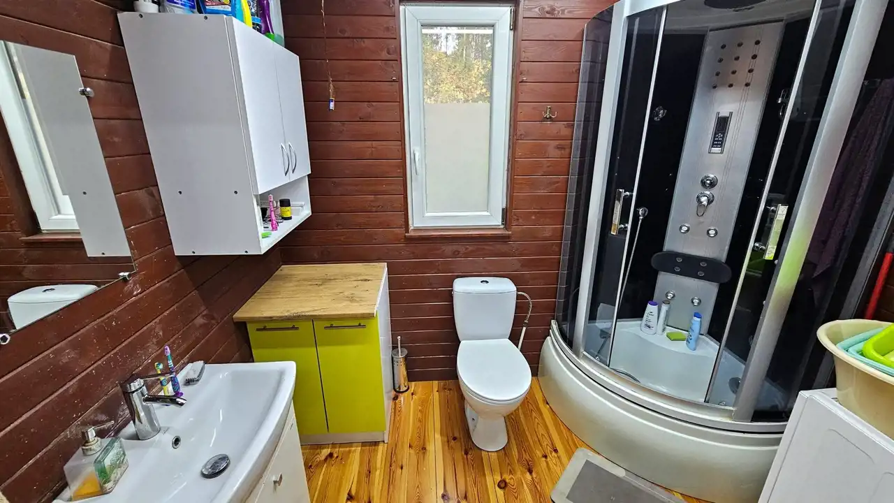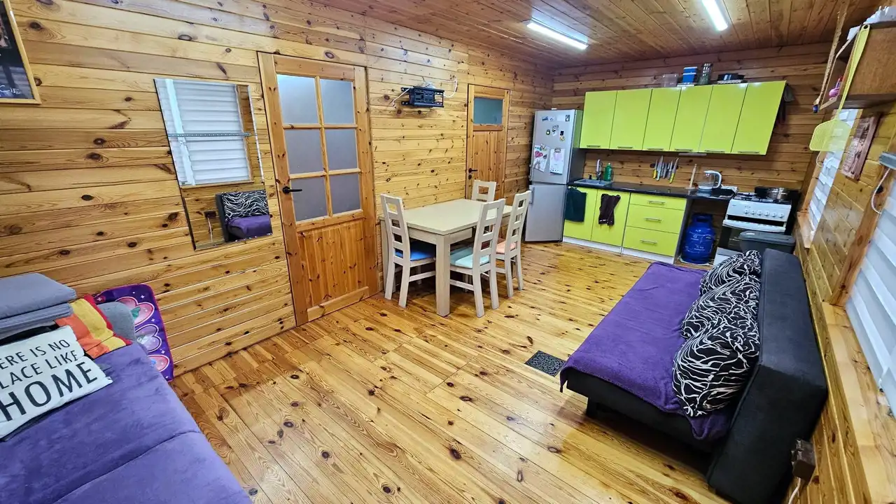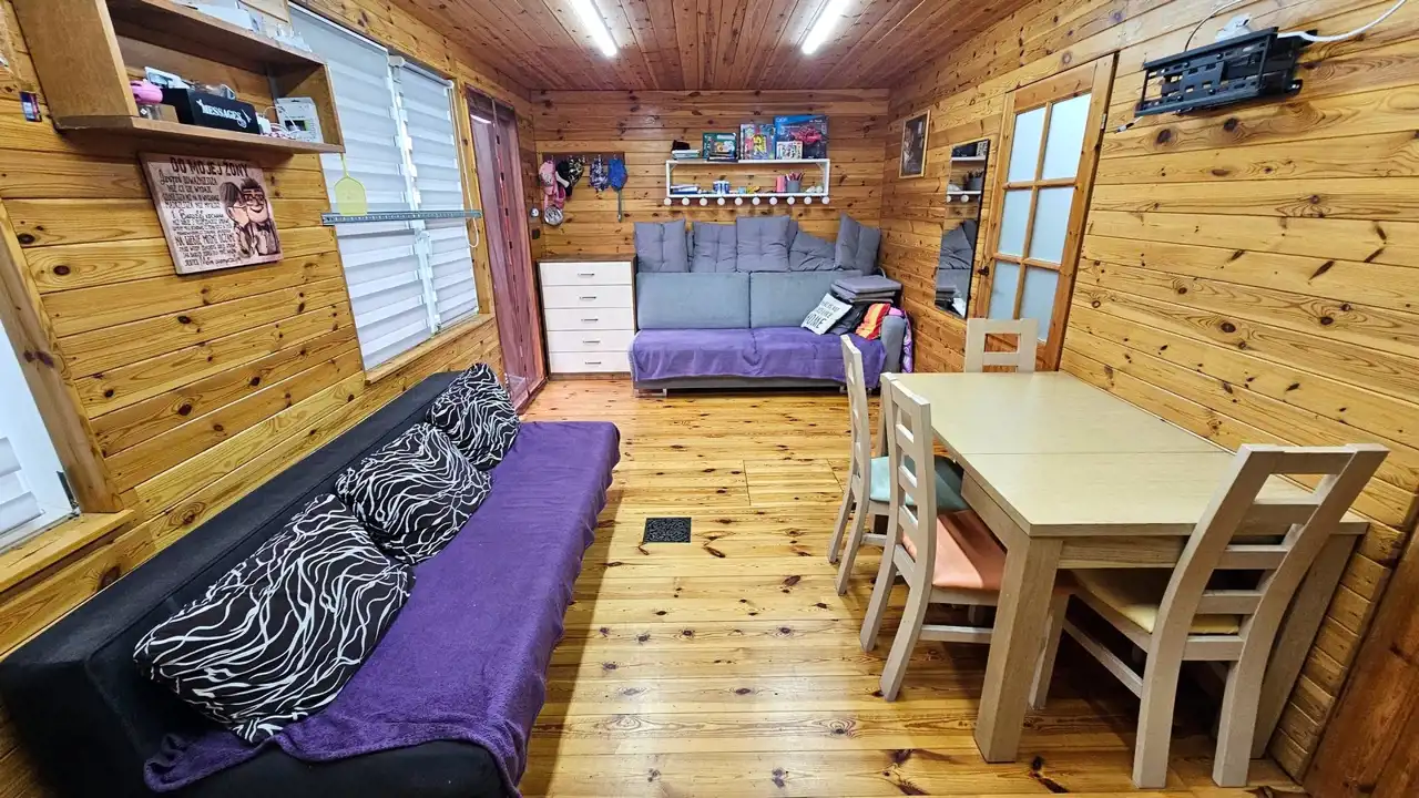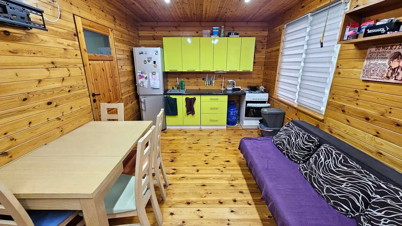 Domek jest wykonany bardzo starannie. Po remoncie. 35 m2 pierwsza kondygnacja poziom piwnicy. Dwa duże pomieszczenia murowane. Plus piętro konstrukcja drewniana z wełną mineralną. Salon z kuchnią i sypialnia. Do zamieszkania od zaraz. Okna PCV. Rynny PCV. Dach - gonty. Na podłogach deski, na ścianie boazeria. W salonie kanapa, komoda, stoły, krzesła. Aneks kuchenny z oknem. Zabudowa kuchenna, kuchenka gazowa, lodówka, zlew, bojler elektryczny. Prąd, woda działkowa i własna studnia. Włączane na cały rok. Działka w całości ogrodzona płotem z siatki. Zagospodarowana. Możliwość wjazdu autem. Ogrzewanie - elektryczne plus piecyk gazowy. Duży taras. Domek posiada antenę TV, Na działce trampolina i basen. Domek gospodarczy. W pobliżu las. Wyposażenie domku w cenie (do uzgodnienia). Duży parking dla aut na działkach.