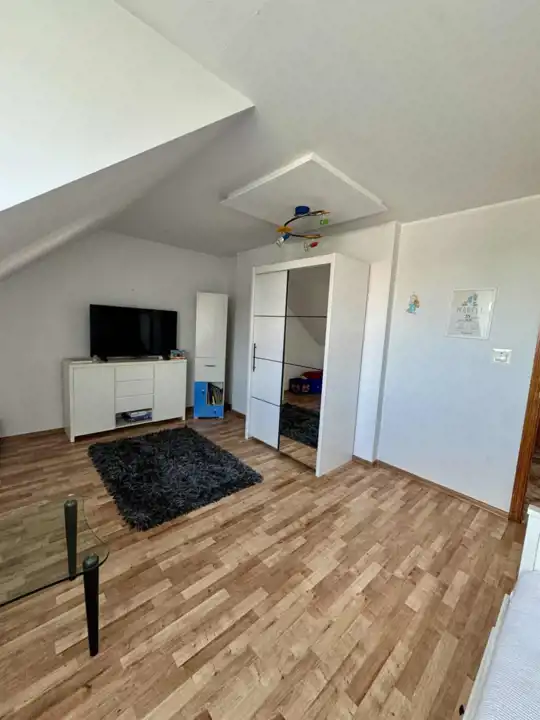 - piętro: trzy sypialnie, mały pokój, łazienka, oraz otwarta klatka schodowa