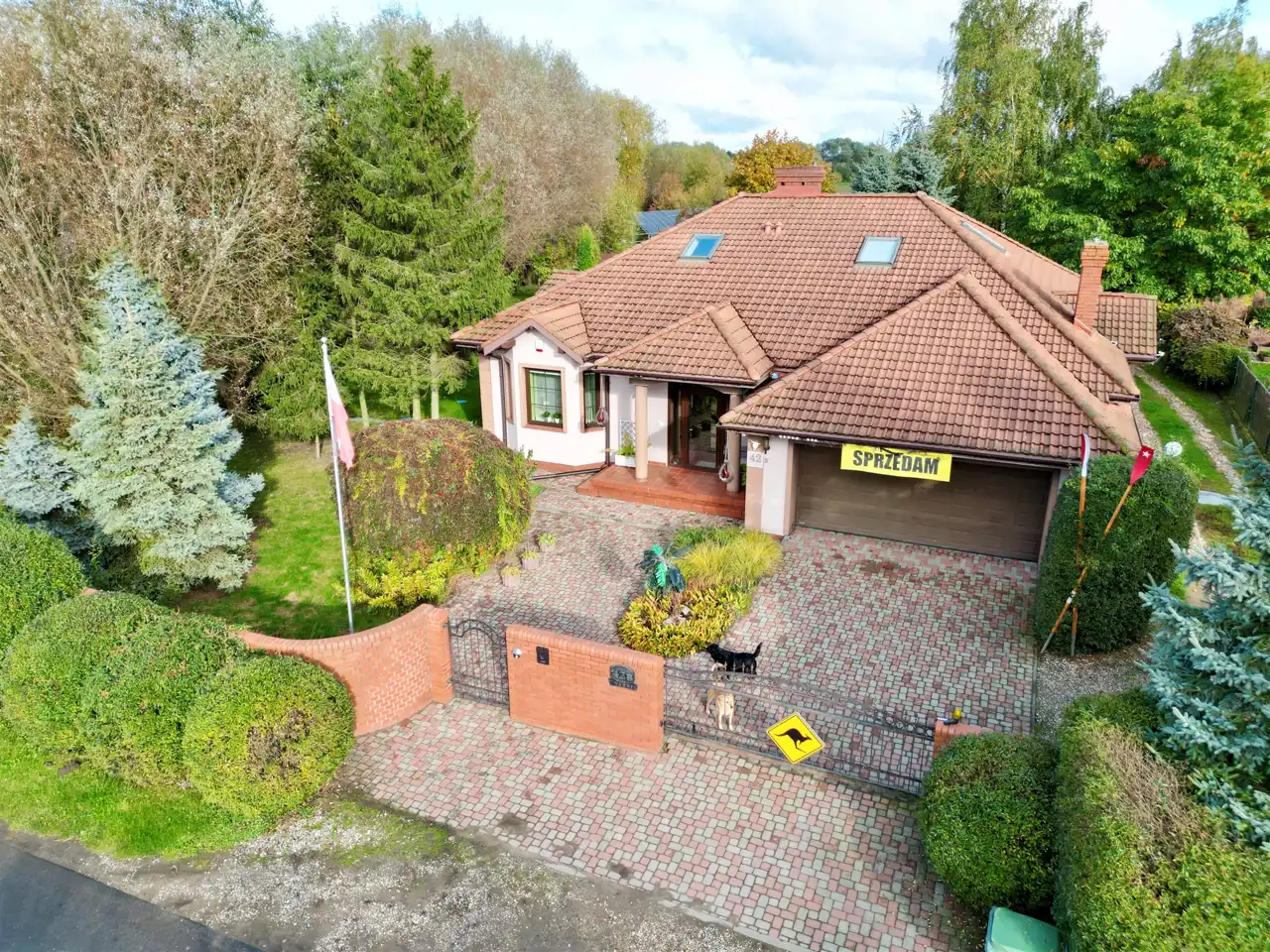 Ogrodzenie z kutego metalu i cegły klinkierowej, duży podjazd z kostki brukowej oraz przestronna działka o powierzchni 2009 m² zapewniają prywatność i estetyczne otoczenie.