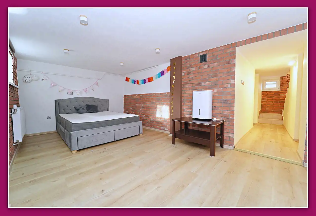 OSTATNI GRUNTOWNY REMONT WNĘTRZA MIAŁ MIEJSCE W 2021 r. - przeprowadzono wówczas remont podpiwniczenia w którym zaprojektowano dodatkową nastrojową sypialnię (ściany wyłożono cegłą naturalną, co wraz z odpowiednio zaprojektowanym oświetleniem tworzy niesamowity klimat wnętrza), ponadto wygładzono i odmalowano wszystkie ściany budynku oraz wykonano nowoczesną zabudowę kuchenną wraz z wymianą sprzętu AGD ( piekarnik, płyta gazowa, zmywarka, lodówka)