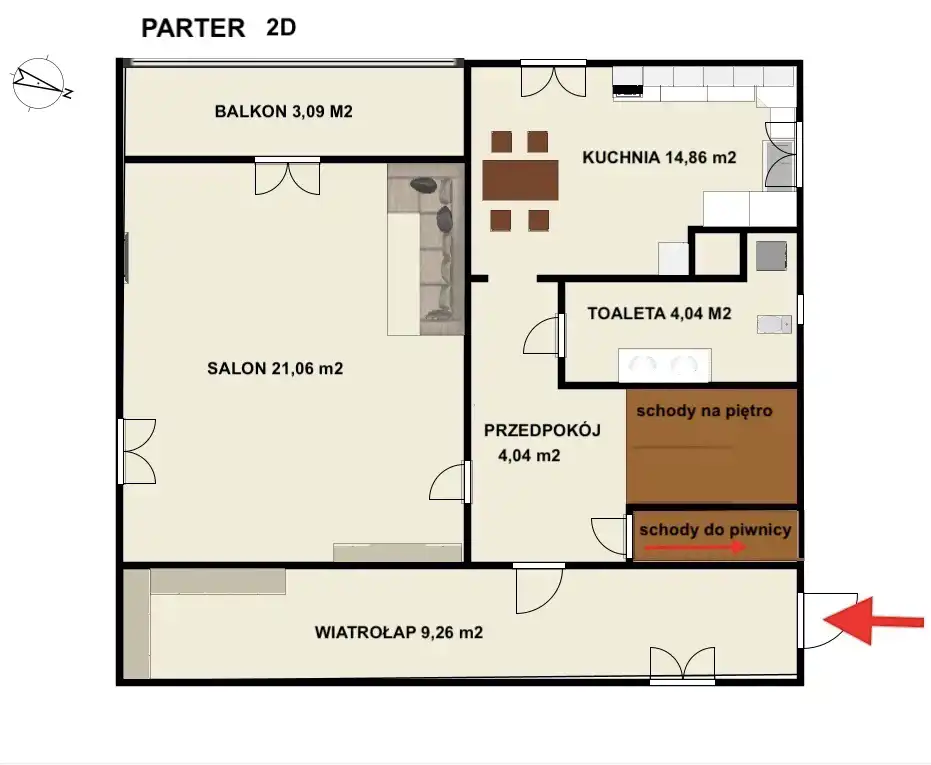 NA PIERWSZEJ KONDYGNACJI znajduje się wiatrołap, przedpokój, pokój dzienny z wyjściem na balkon, oddzielna kuchnia i łazienka z WC.