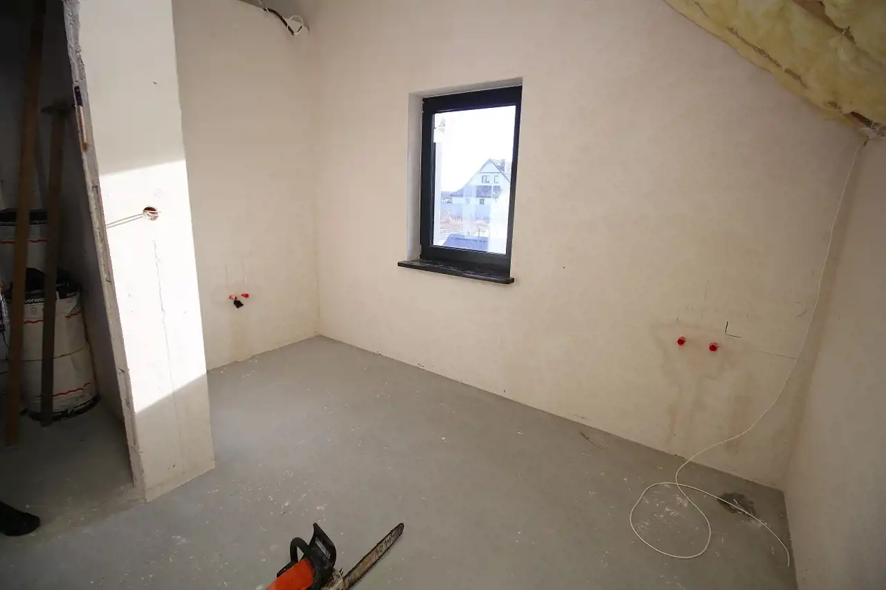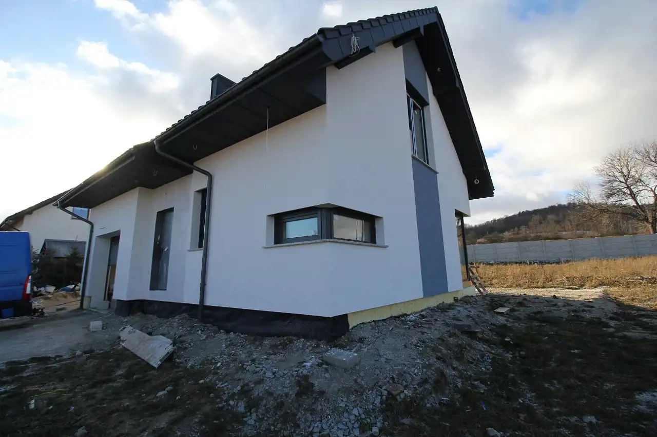 Do sprzedania wolnostojący dom w Siodłkowicach, gmina Dobromierz w stanie deweloperskim. Dom z projektu "Dom Pod Liczi" Archon. Dom w stanie deweloperskim: Na ścianach tynki, na podłogach wylewki