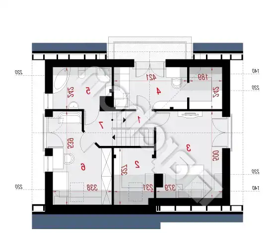 Piętro: hol, pokój, pokój z garderobą, pokój z garderobą, łazienka z wc, pokój, hol