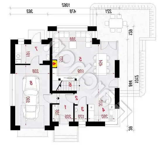 salon z jadalnią, aneks kuchnia, wiatrołap, hol, kotłownia, garaż