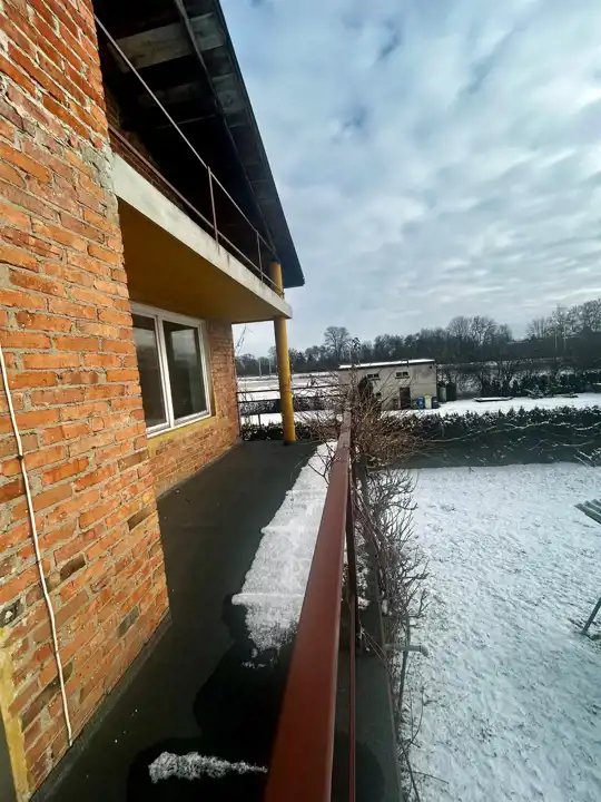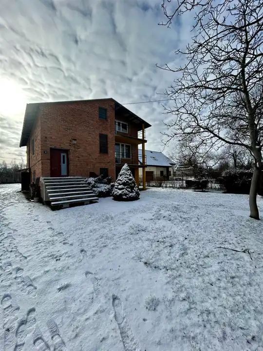 Nieruchomości składa się z domu posiadającego wysokie podpiwniczenie z oknami o wysokości ok. 2,20 m z osobnym wejściem , w bryle budynku są dwa garaże z wjazdami z dwóch stron domu na piętrze umiejscowione są trzy pokoje każdy z osobnym wejściem z korytarza i własnym wyjściem na taras , osobne pomieszczenie przeznaczone na kuchnie, łazienka i WC dodatkowo mamy użytkowe poddasze z możliwością zaadaptowania na pokoje, na poddasze prowadzą murowane solidne schody.