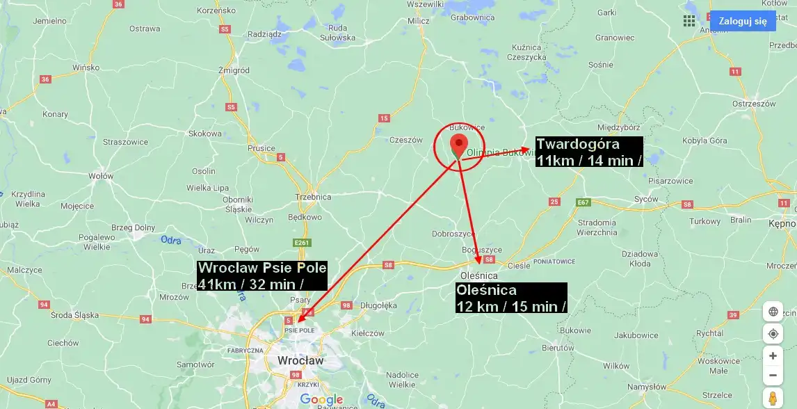 Poza tym szybki dojazd do północnej części Wrocławia ok 30 minut, do Oleśnicy 15 min, do Twardogóry 14 min.
