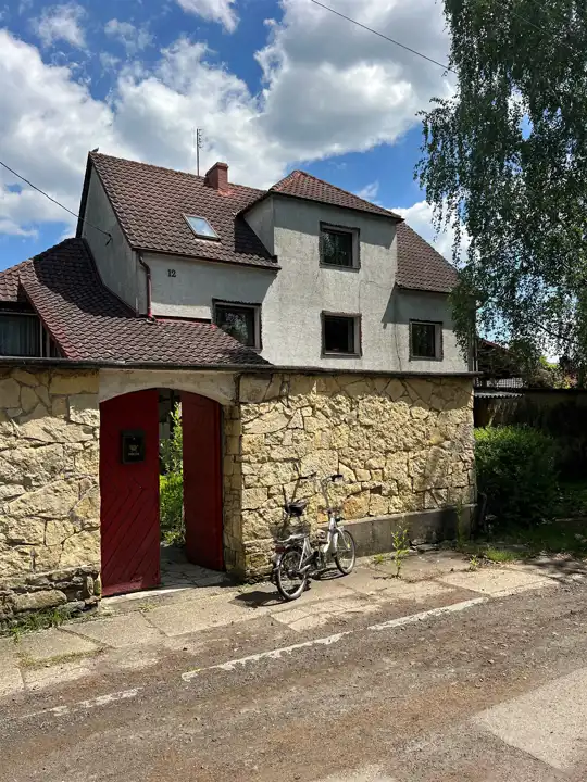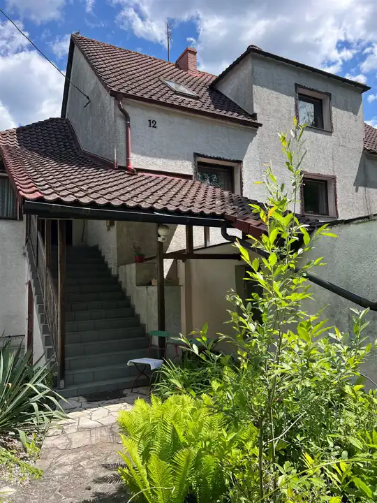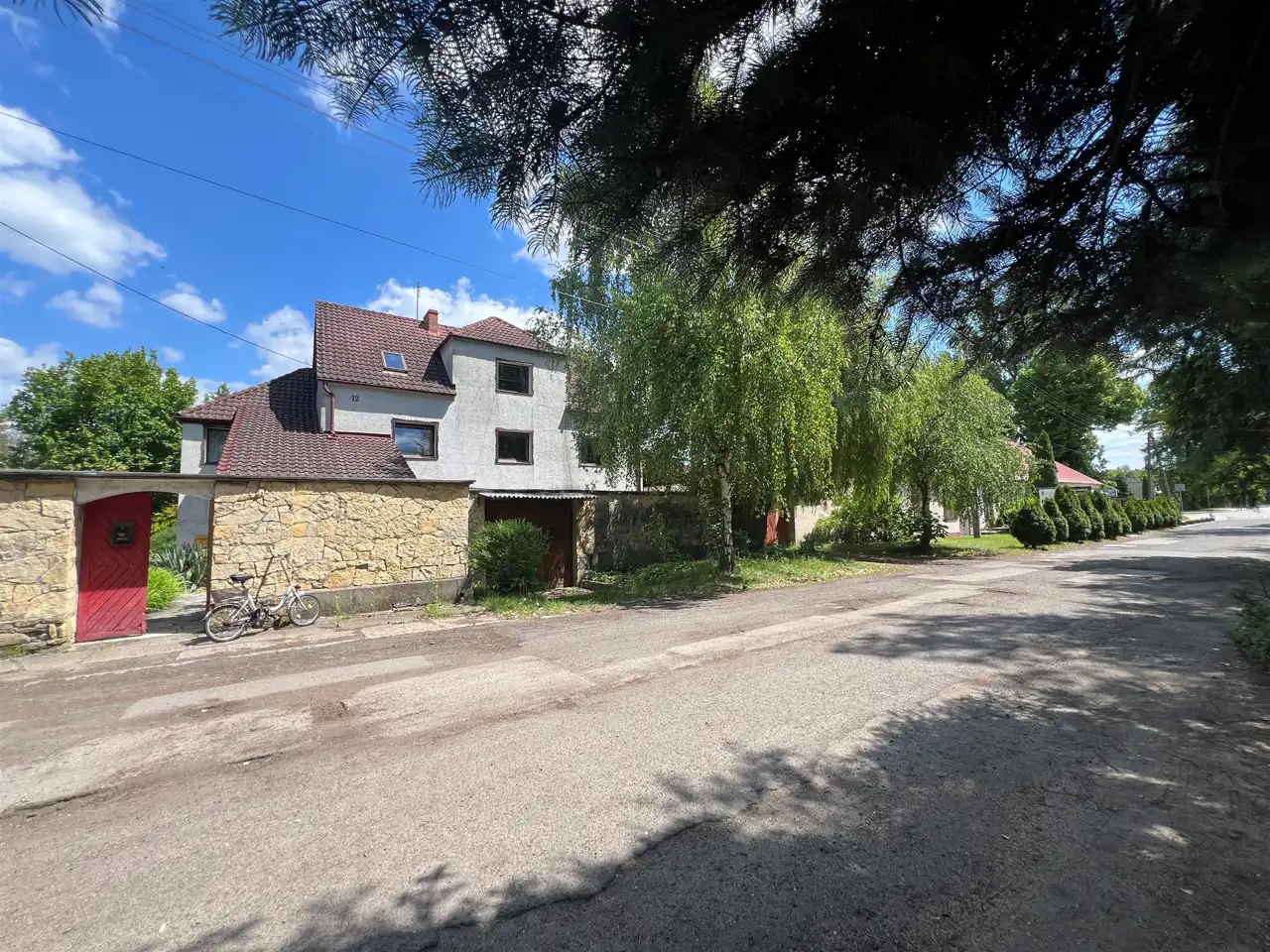 Od frontu stoi lekko cofnięty dom 17mx9m. Dom posadowiony jest na XVIII- wieczych fundamentach z wysokim przyziemiem z oknami, które w max wysokości sklepienia ma 3 m wysokości. Są to łukowe ceglane sklepienia, bardzo klimatyczne i przypominające o pierwotnym charakterze nieruchomości. Pierwotnie był to budynek sądu, który w zawierusze czasów, wielokrotnie był przebudowywany i -obecnie jest użytkowany jako nieruchomość mieszkalna.
